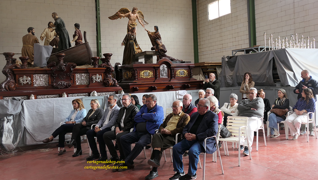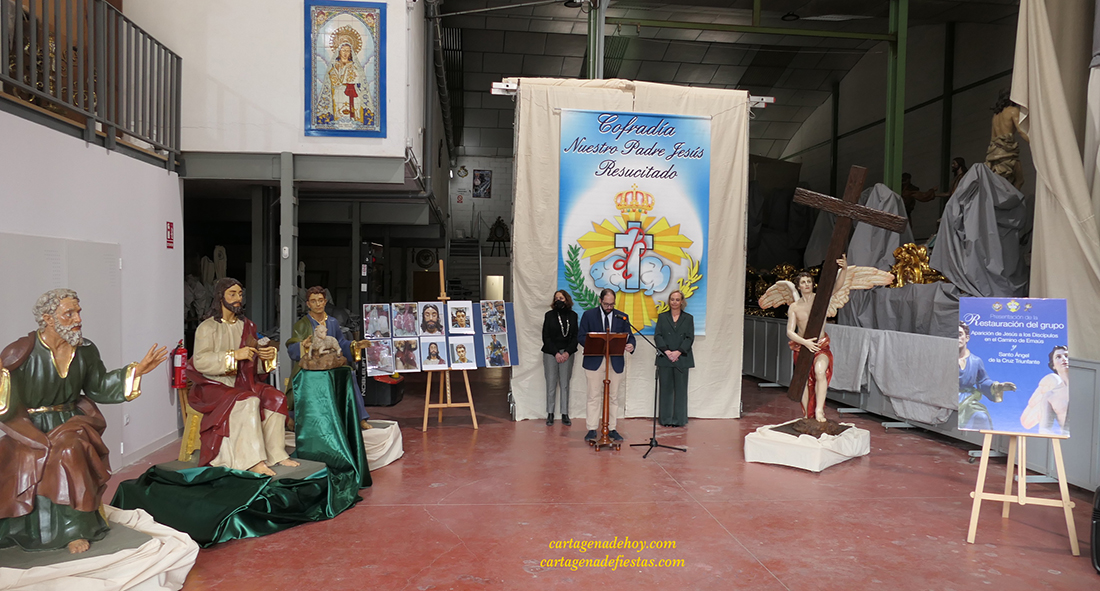 El almacén de tronos de la Real e Ilustre Cofradía de Nuestro Padre Jesús Resucitado se ha convertido esta mañana en una sala de exposiciones en la que se ha presentado la restauración del grupo escultórico de Federico Coullaut-Varela de los Discípulos de Emaús, así como la intervención llevada a cabo en la imagen del Santo Ángel de la Cruz Triunfante, obra de José Antonio Hernández Navarro.