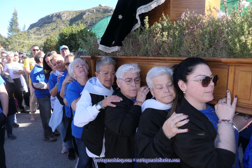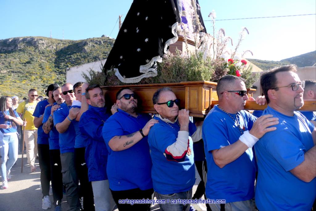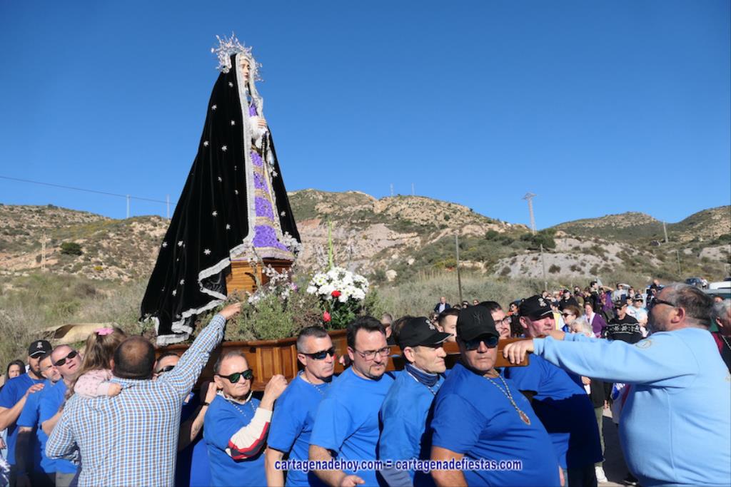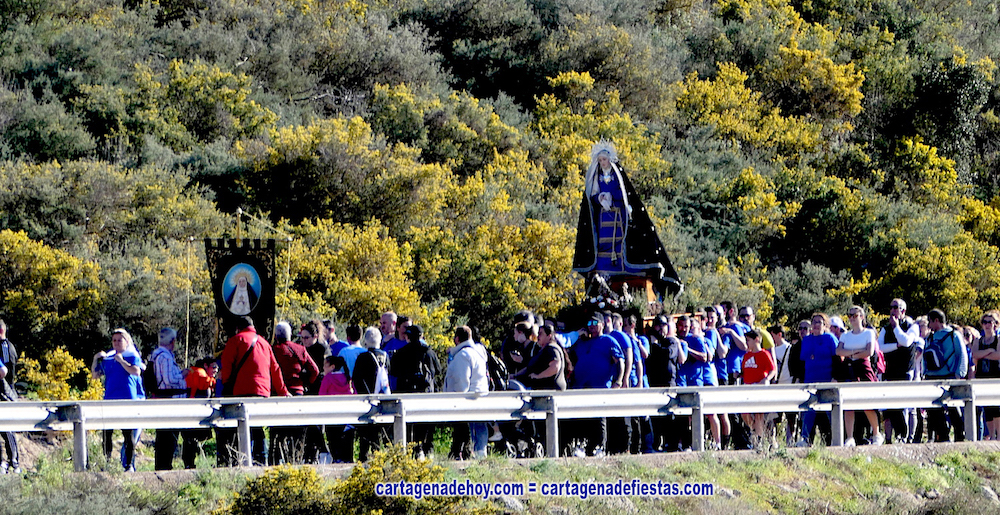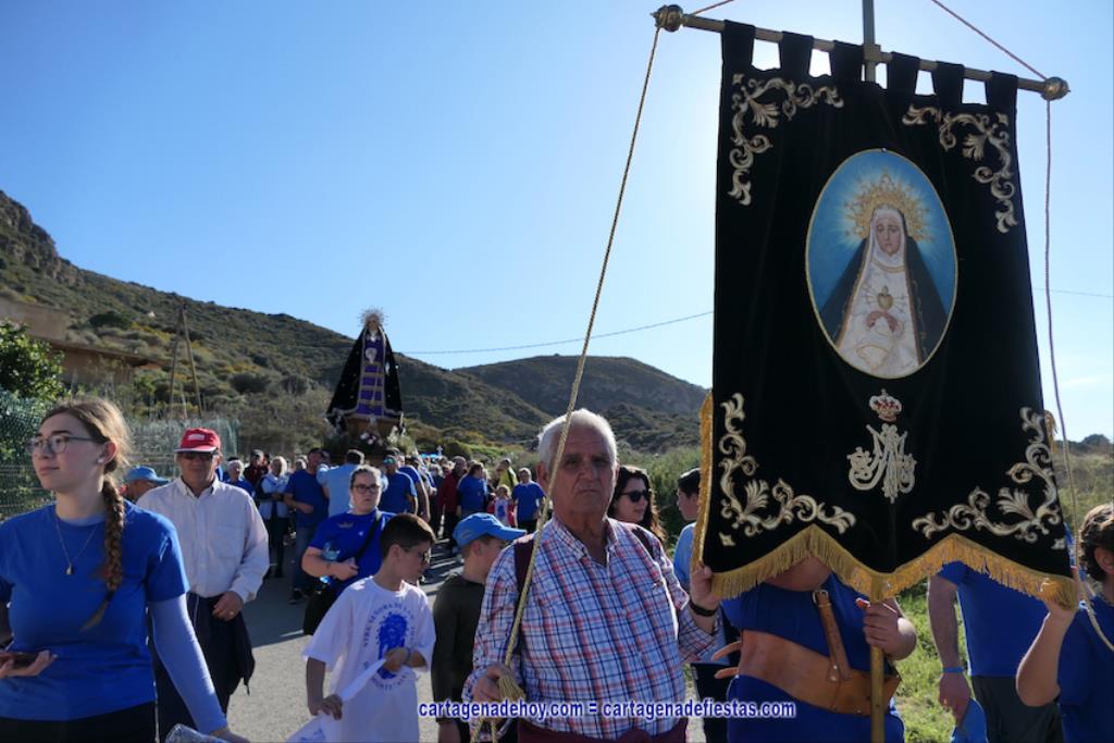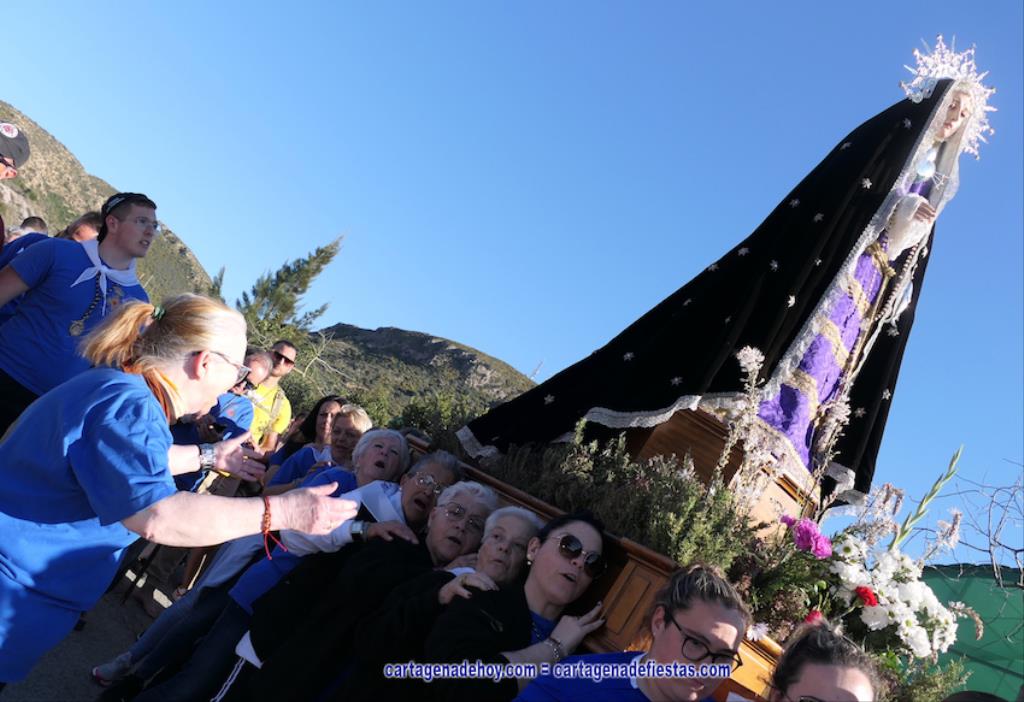 Las cuatro de la tarde era el horario fijado para que saliese de su ermita y una hora y cuarto ha tardado esta vez en culminar el descenso, el cual ha tenido su tramo más complicado por los cuatrocientos metros sobre suelo de tierra, para después entrar en el asfalto. En todo momento, la imagen no ha dejado de 'escuchar' vivas y cánticos como el que incluía la frase: "Que nuestro amor por ti se haga eterna romería". Los rezos son habituales en la romería de subida, mientras que en la de esta tarde han sido dos los momentos en que se han llevado a cabo, en ambas ocasiones dirigidos a las personas fallecidas y girando la imagen hacia el cementerio de Nuestra Señora de los Remedios.