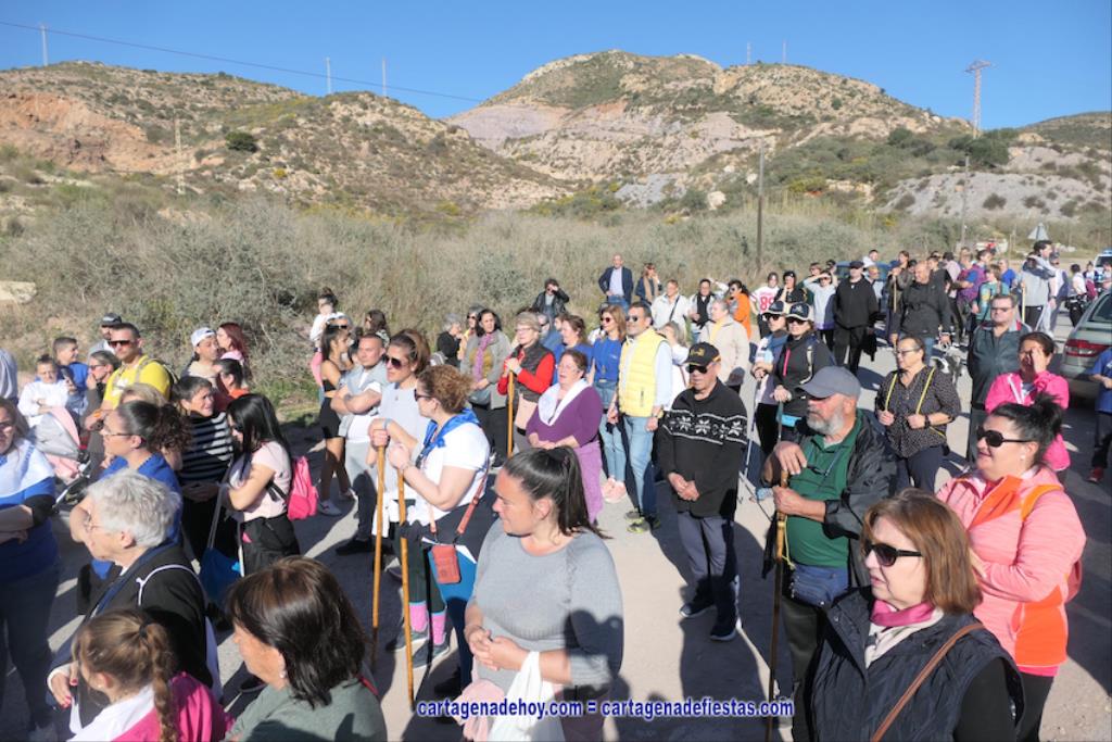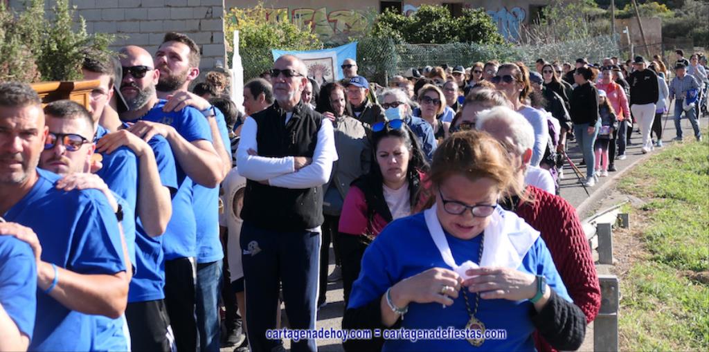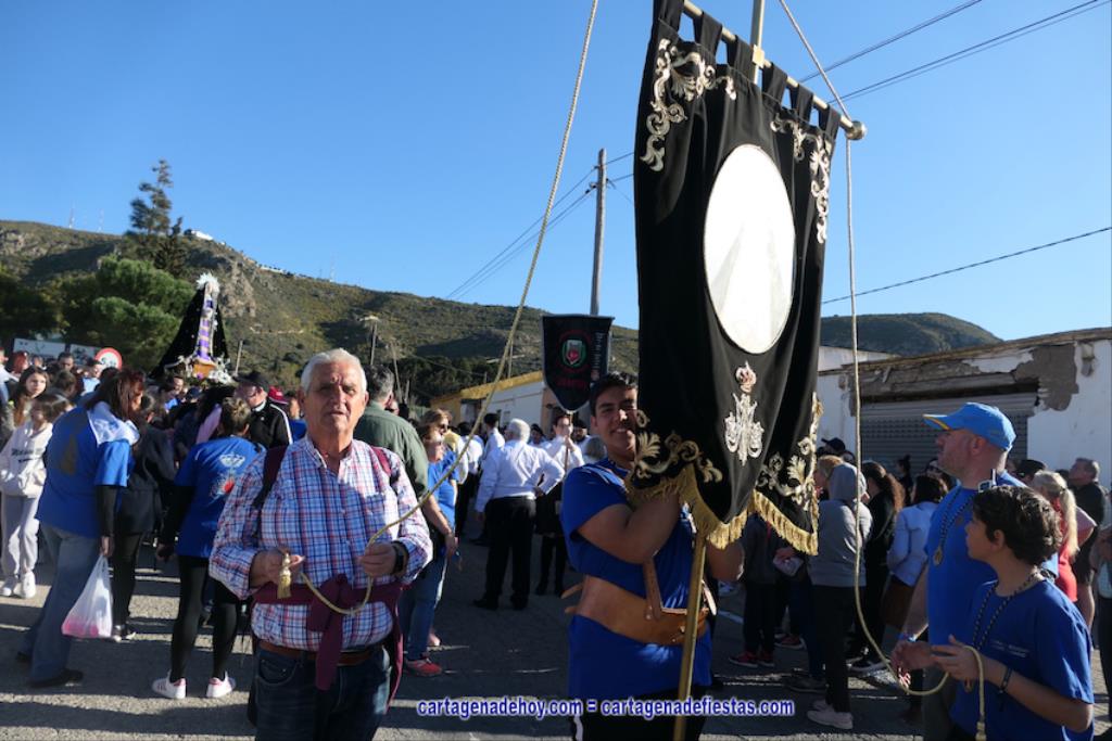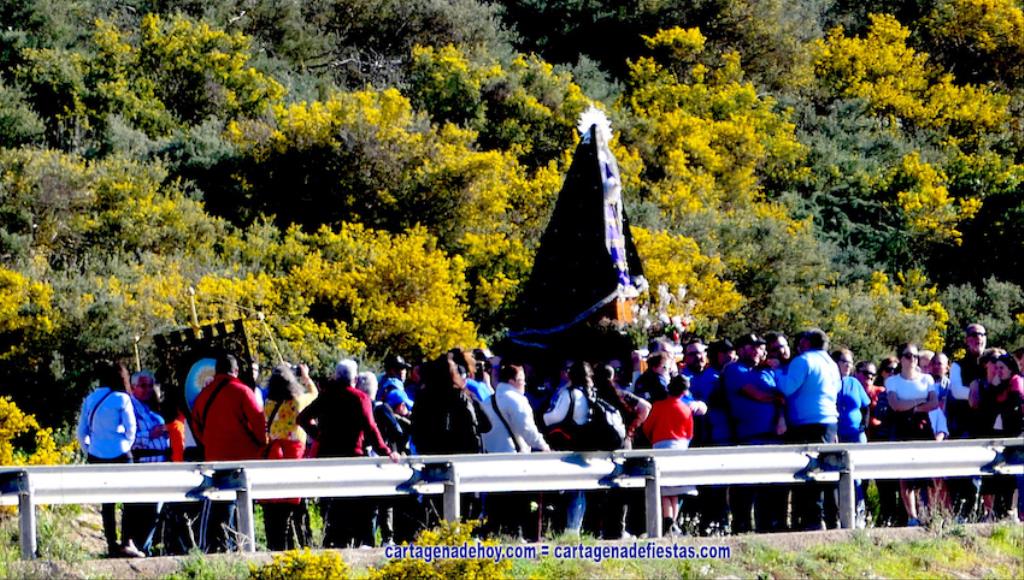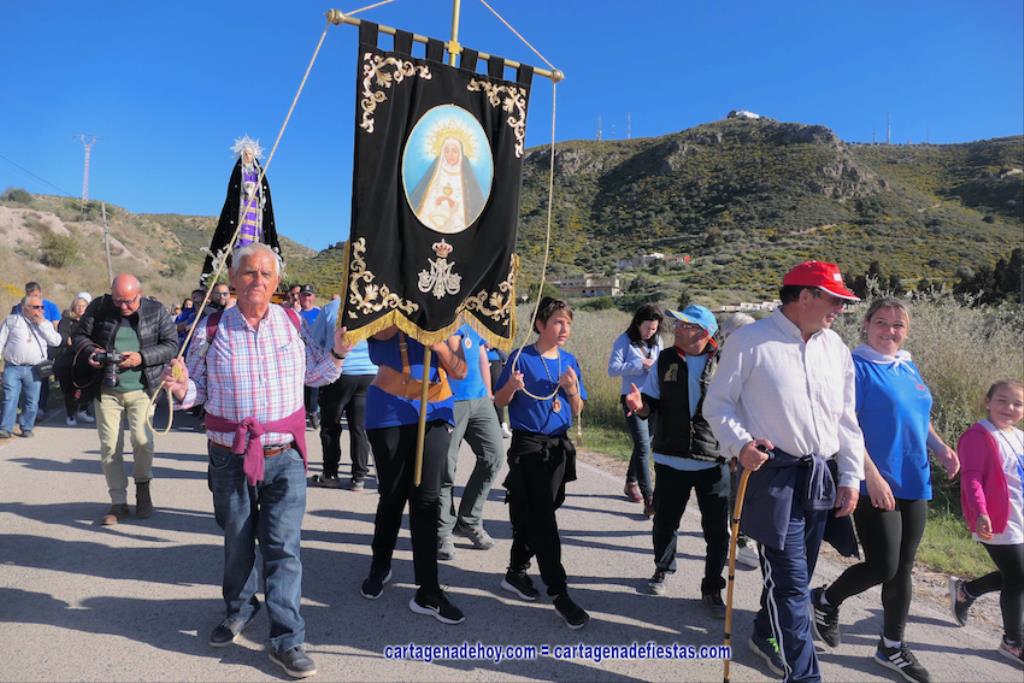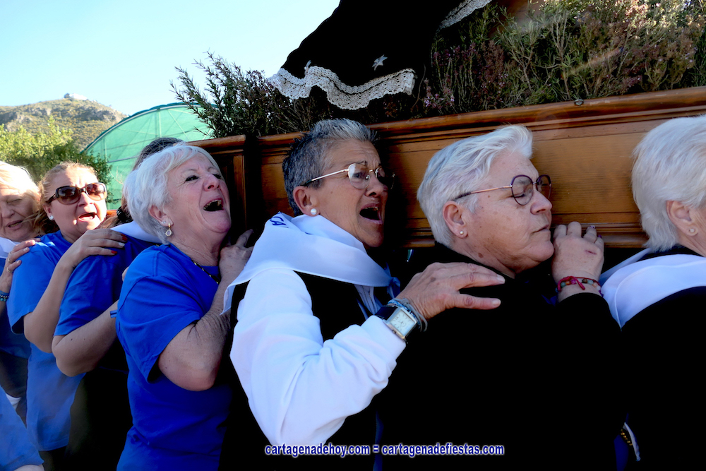 Las cuatro de la tarde era el horario fijado para que saliese de su ermita y una hora y cuarto ha tardado esta vez en culminar el descenso, el cual ha tenido su tramo más complicado por los cuatrocientos metros sobre suelo de tierra, para después entrar en el asfalto. En todo momento, la imagen no ha dejado de 'escuchar' vivas y cánticos como el que incluía la frase: "Que nuestro amor por ti se haga eterna romería". Los rezos son habituales en la romería de subida, mientras que en la de esta tarde han sido dos los momentos en que se han llevado a cabo, en ambas ocasiones dirigidos a las personas fallecidas y girando la imagen hacia el cementerio de Nuestra Señora de los Remedios.
