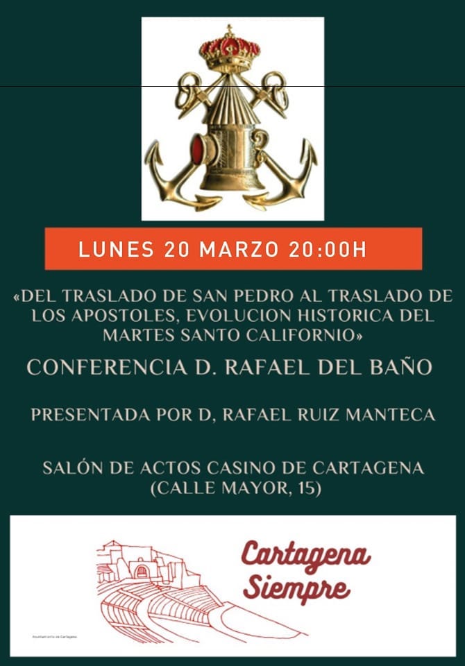Andrés Jerez Rodríguez, comisario de iglesia de la Cofradía Marraja, habló sobre el trabajo dentro de Santa María durante los desfiles pasionarios y en los almacenes de de la hermandad durante todo el año, dentro de una conferencia organizada por la asociación 'Cartagena siempre' sobre Semana Santa. Hoy, nueva cita con el traslado de los apóstoles californios.