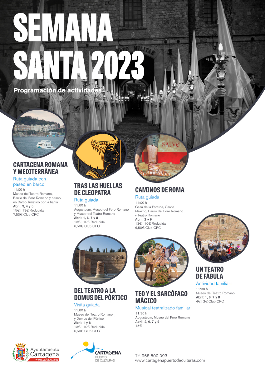 Recorrido: Museo del Teatro Romano, Barrio del Foro Romano y paseo en Barco Turístico por la bahía. Días: 3 ,4 y 5 de abril. Hora: 11:00 h. Salida desde el Museo del Teatro Romano, el Barco 16:30 h, desde la Escala Real del Puerto. Precio: individual, 15€, reducida 13€. Club Cartagena Puerto de Culturas: 7,50€.