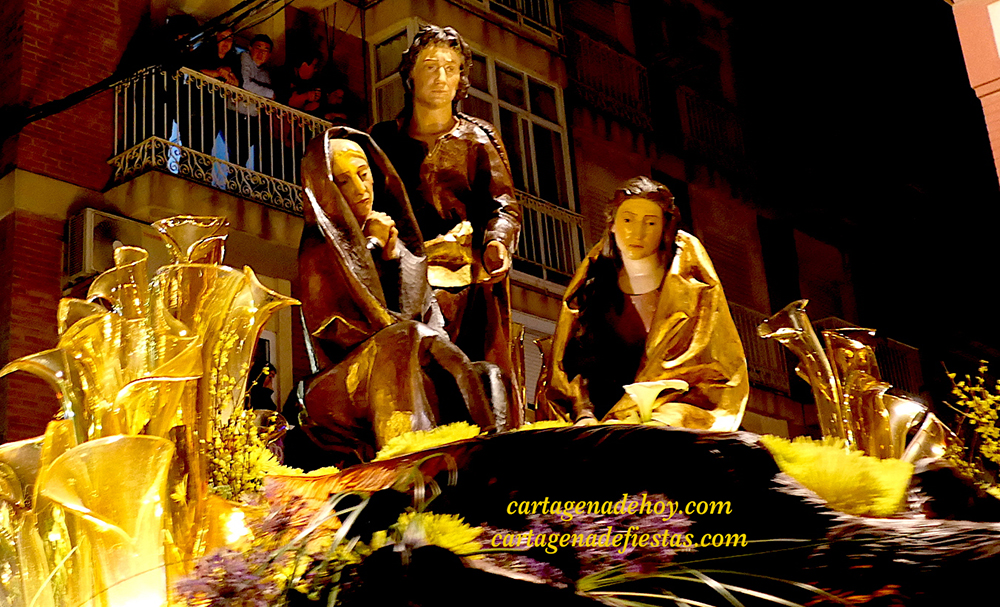 El grupo que integran San Juan, María y María Magdalena, que desfila sobre el trono más vanguardista de la Semana Santa de Cartagena, fue creado por José Capuz en 1953, el Cristo del grupo del Expolio es del escultor Juan Abascal Fuentes en 1982 y el lábaro de la agrupación de armadas fue elaborada por Aladino Ferrer en 1943.