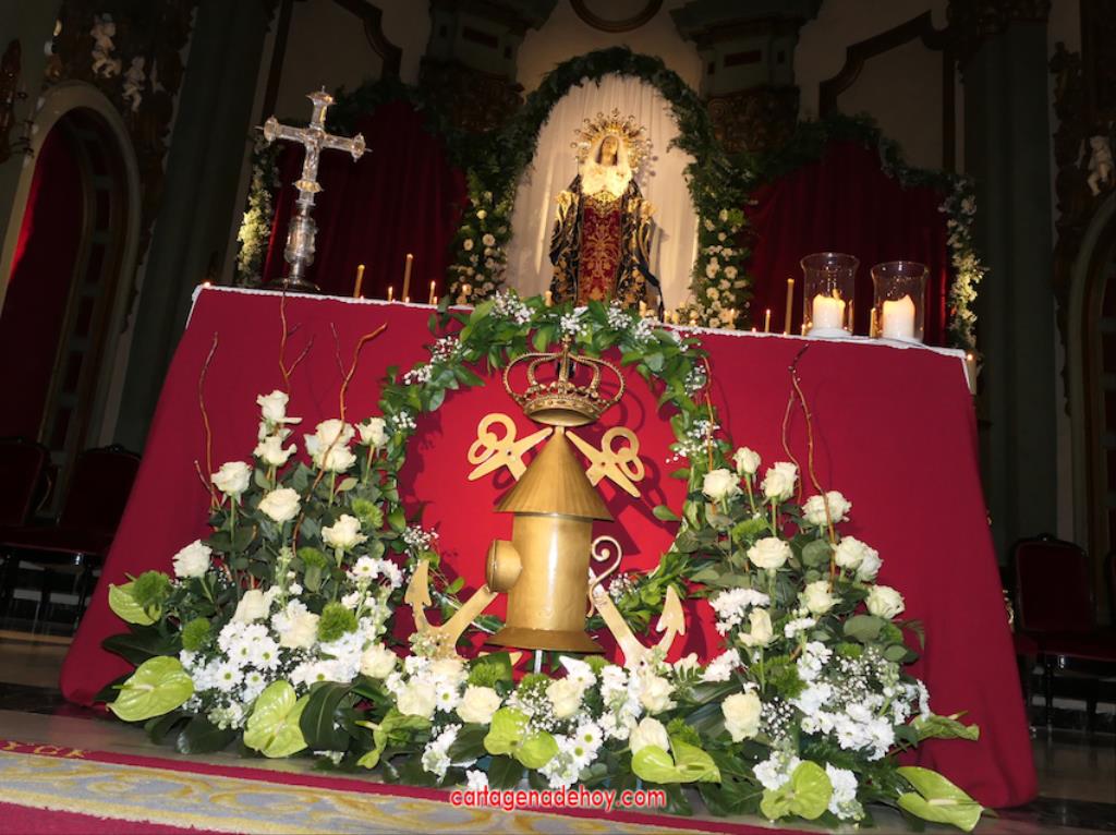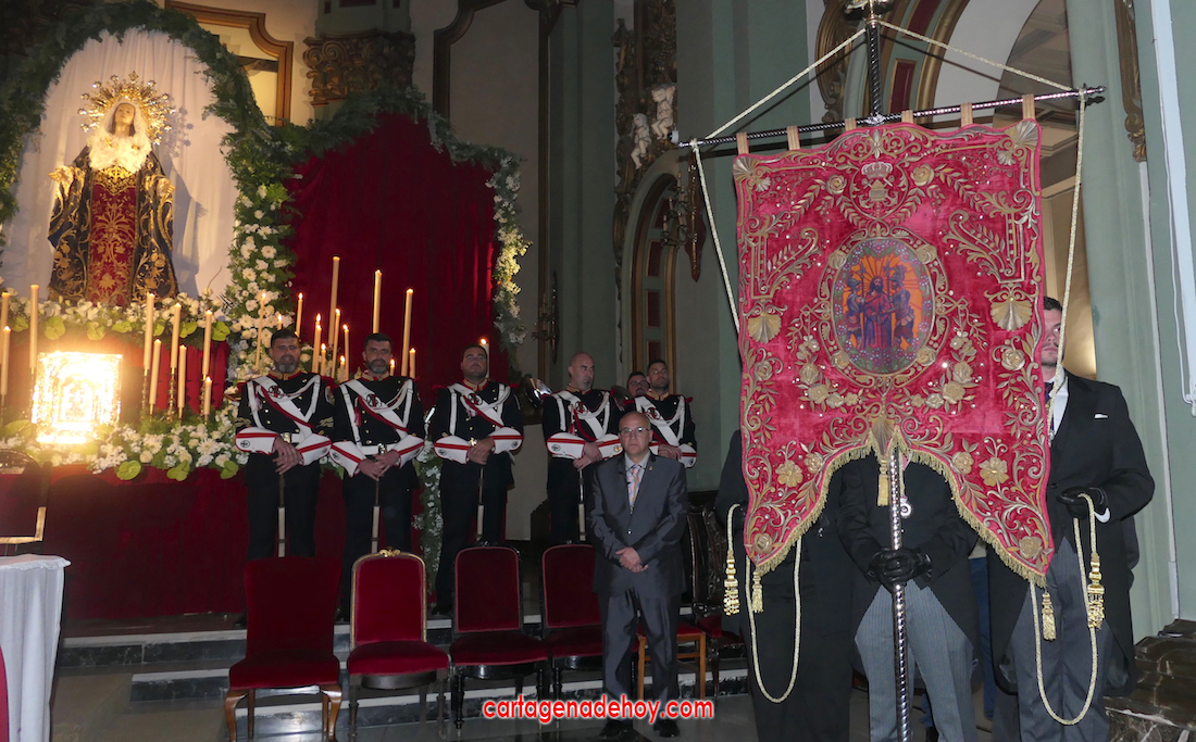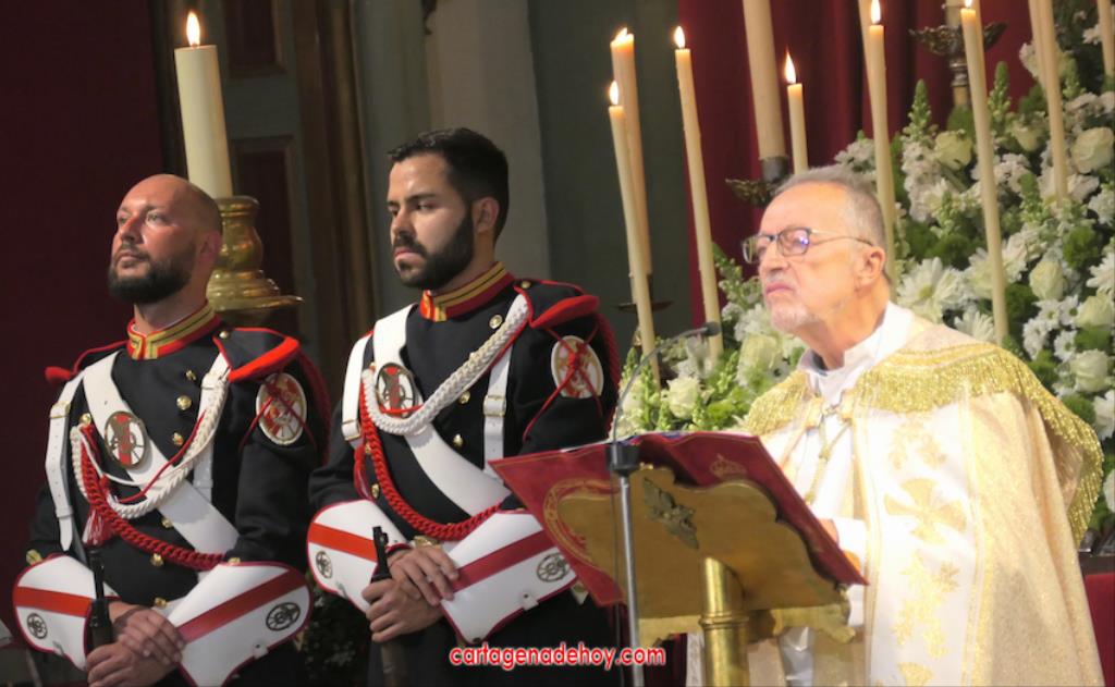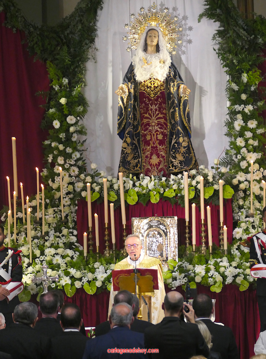 El capellán californio, Francisco de Asís Pagán, tras la lectura del capítulo de Lucas centrado en el primer dolor de la Virgen, ha centrado su homilia en María y en lo que debe servir para oriental al católico "hacia Dios", para después destacar de ella que fue "la primera que escuchó la palabra de Dios y la cumple", haciendo hincapié que lo primero parea dialogar "es la capacidad de escuchar al otro con atención y paciencia", afirmando que escuchar y dialogar "humaniza y une a las personas", facilitando "trabajar en equipo2. También le pidió a la Virgen por las cofradías cartageneras "para que escuchen, dialoguen y acojan el corazón de Dios".