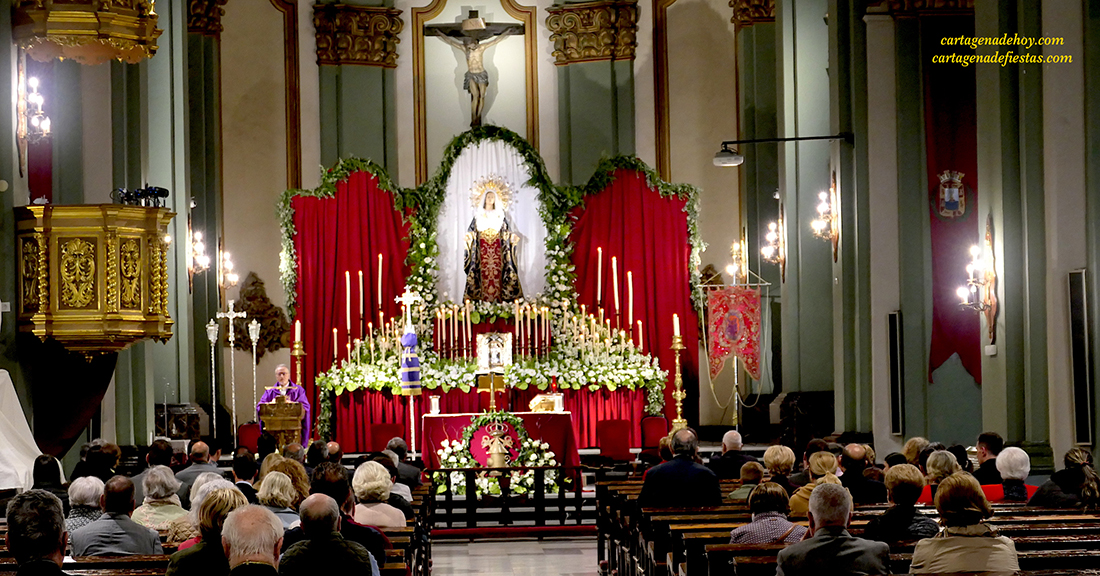 Las misas de las intenciones de las agrupaciones californias, dentro del novenareio de la Virgen del Primer Dolor, siguen celebrándose a diario hasta el mismo Viernes de Dolores en la iglesia de Santa María, donde están los tronos que saldrán en la procesión de mañana noche.