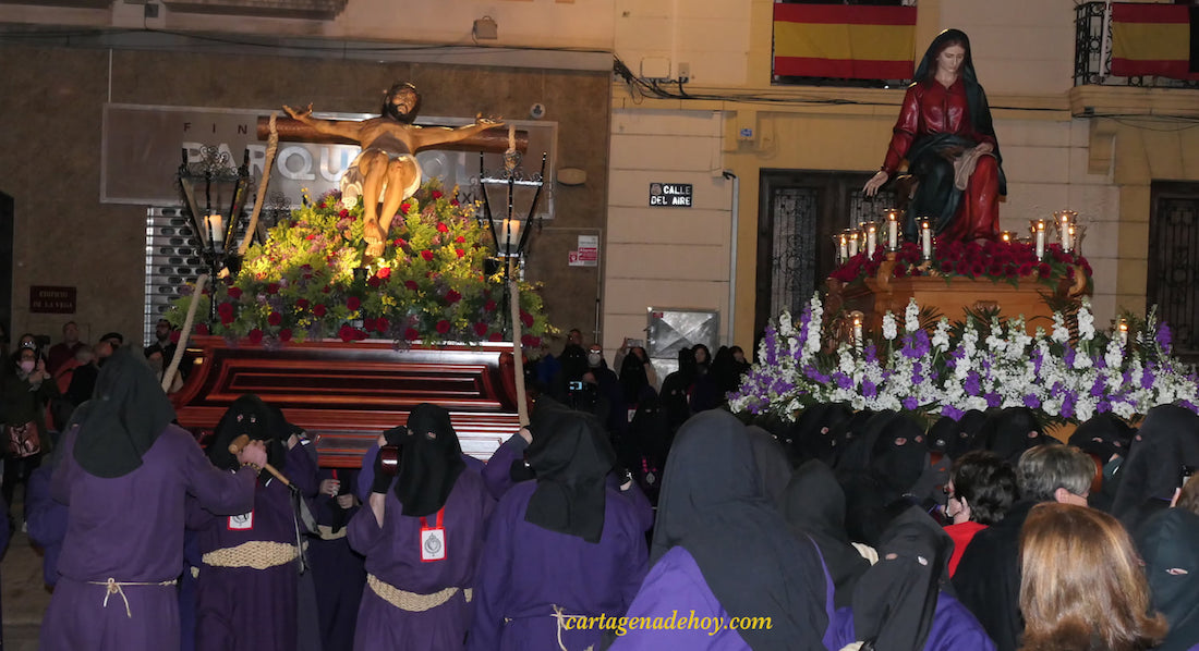 El 'camino de la cruz' de esta noche reproduce cómo eran las procesiones en el siglo XVII, cuando aún no se había implatado el típico orden cartagenero. Comenzará a las 3.30 horas en la calle del Sepulcro, próximo a la parte superior del Teatro Romano y cercana a la Catedral Vieja, donde la cofradía tiene su capilla. Ambas tallas descenderán hasta la plaza de San Ginés, donde escucharán las primeras saetas. Después irán a la iglesia de Santa María, donde cantarán la salve a la Virgen del Rosell, patrona de Cartagena cuando se constituyó la hermandad. Habrá altos con rezos con motivo de las 14 estaciones del vía crucis, siendo especial el de las seis de la mañana en la basílica menor de la Virgen de la Caridad, donde tendrá lugar uan eucaristía. Después regreso a la plaza de San Ginés, donde está previsto que llegue el cortejo sobre las siete y media de la mañana. Después de la salve se separarán ambas tallas.