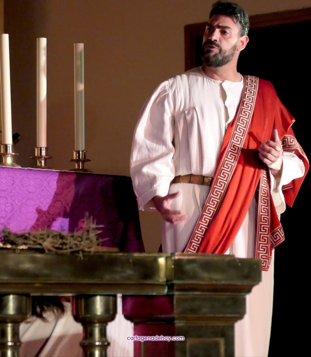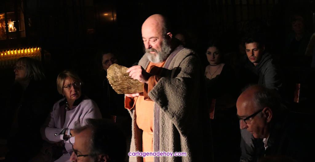 Esta vez, la representación, que se recuperaba tras el paréntesis pandémico, no arrancaba con las escenas del auto sacramental, pues el director de Ditirambo, José Antonio Ortas, quiso agradecer de forma pública el apoyo que desde hace años recibe de la Cofradía de Jesús Nazareno para esta puesta en escena, dedicando esta edición a Domingo Bastida, quien en su etapa como hermano mayor marrajo, fue el que recogió y apoyó la propuesta.