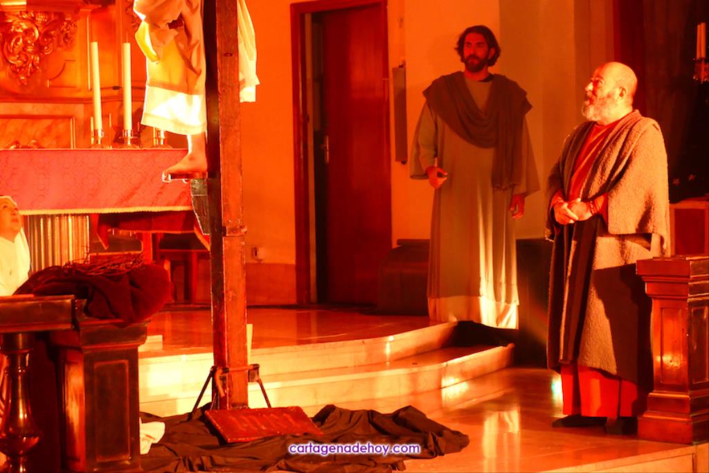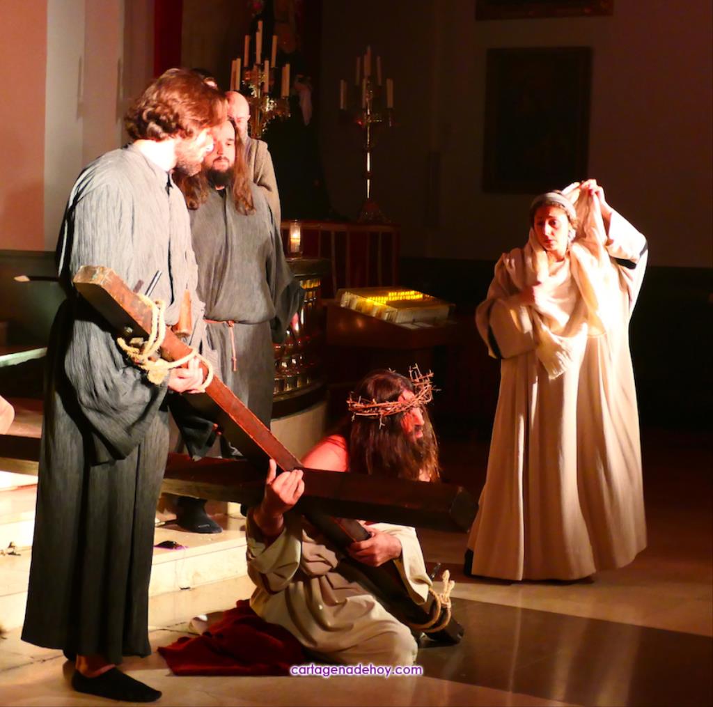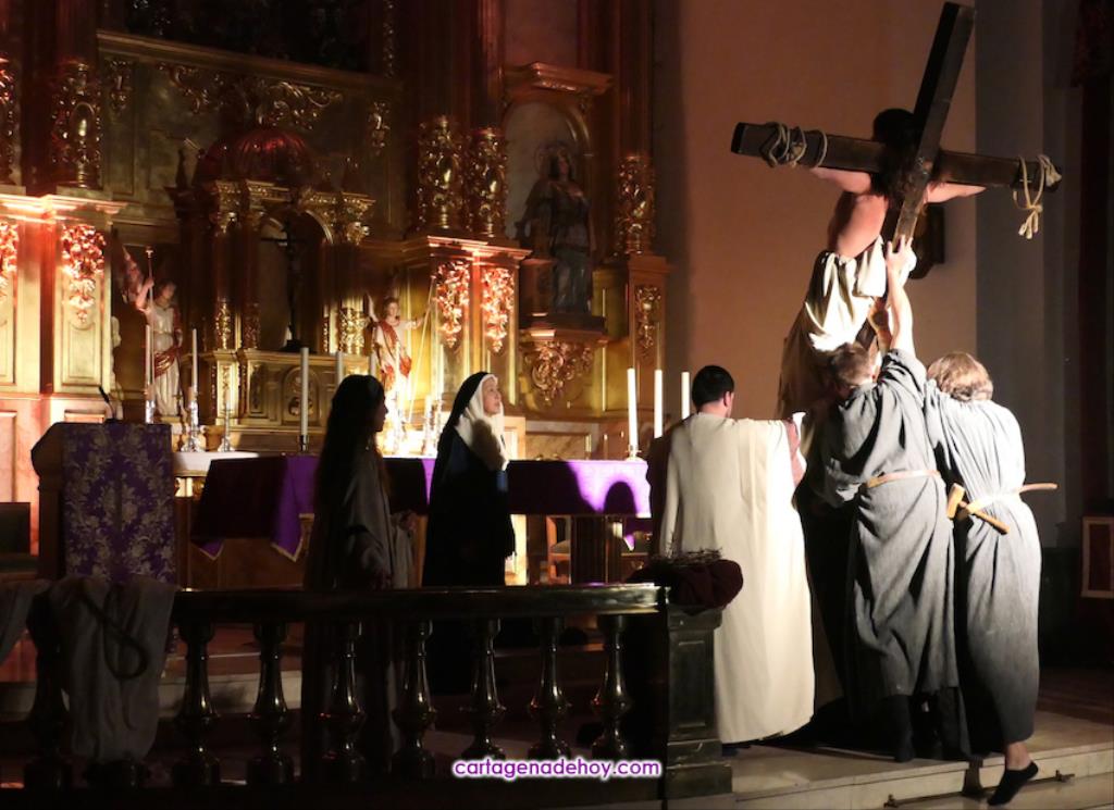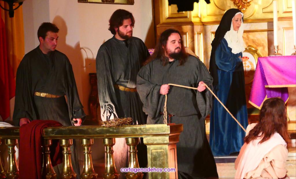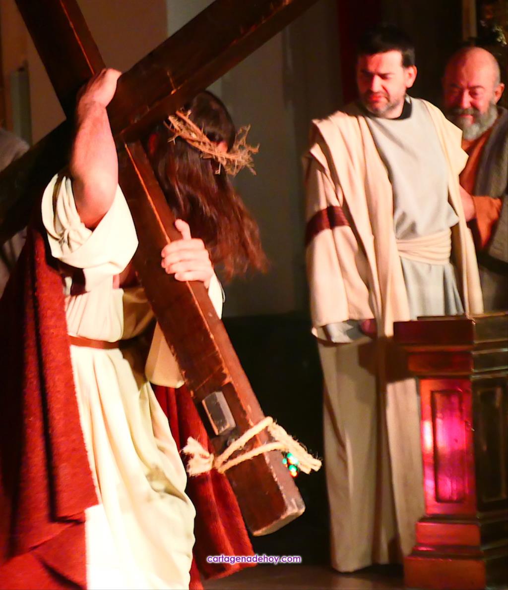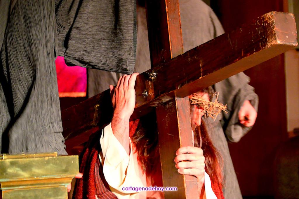 La obra, tras una alocución llevada a cabo por los actores mientras se dirigen, entre el público hacia la zona del altar, comienza con el huerto de los olivos, donde fue apresado Jesús después de ser señalado con un beso por Judas. Con unos diálogos de mucha concreción, el desarrollo continúa con la condena a ser clavado en la cruz por parte de Poncio Pilatos, los castigos y humillaciones que sufrió Cristo y su crucifixión, jalonadas las escenas por la presencia de María Magdalena, de la Verónica (limpiando su rostro) y, en especial, el dolor de su madre, María. Destacar también que la iglesia de Santo Domingo ocupó todas las localidades para ver la obra.