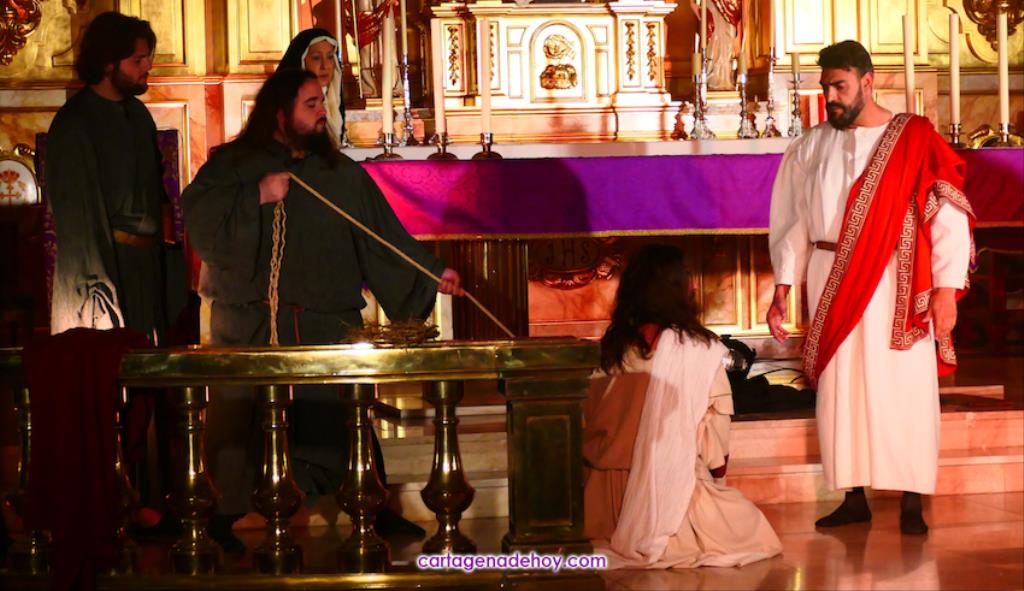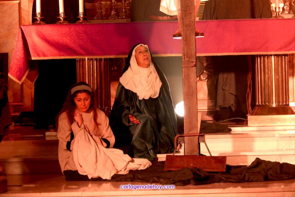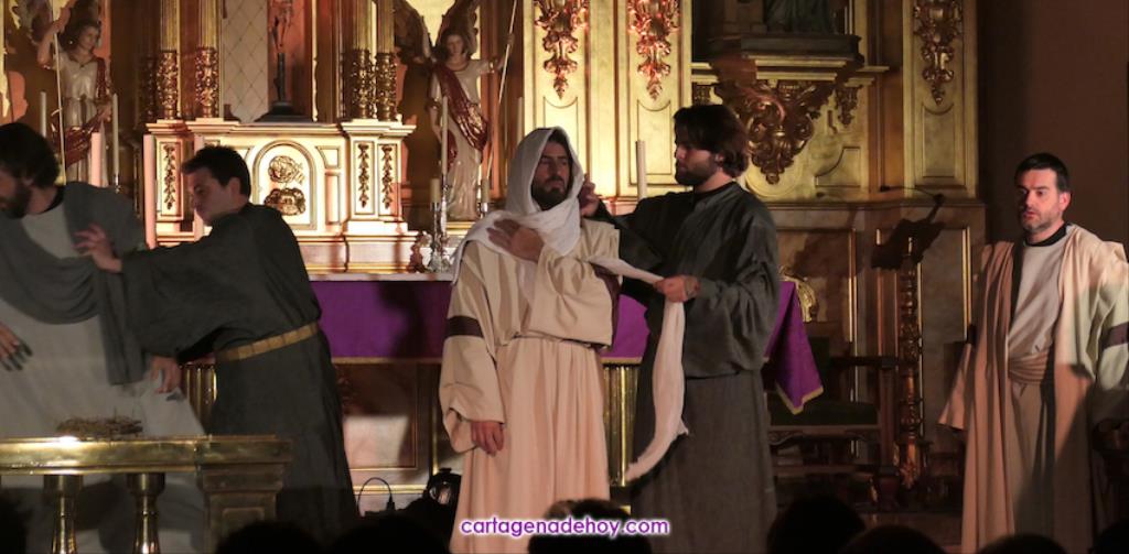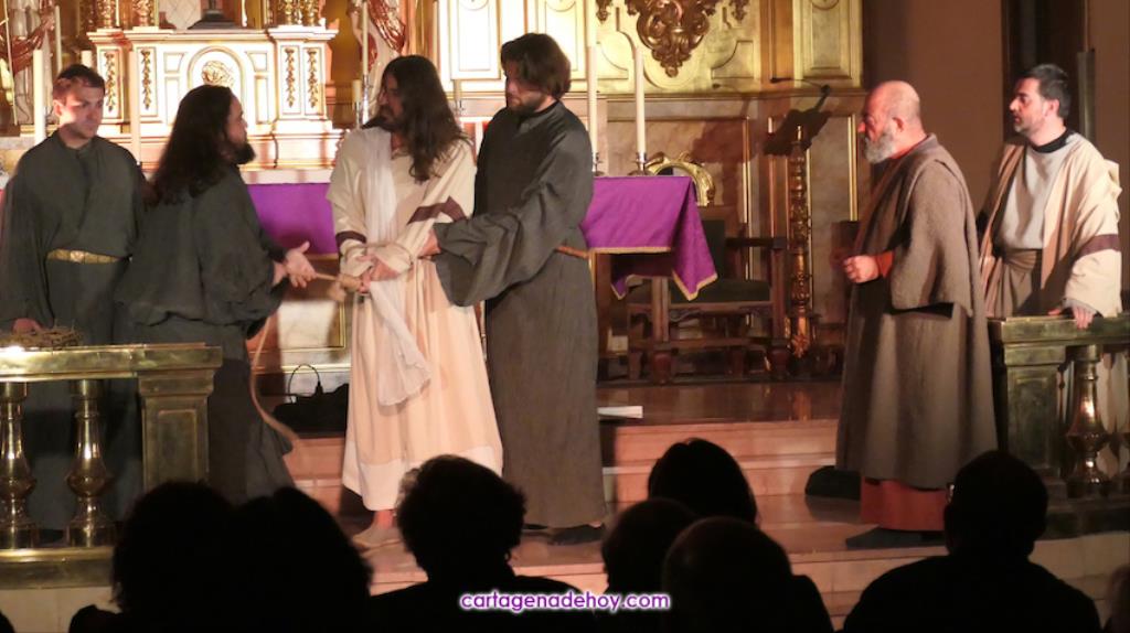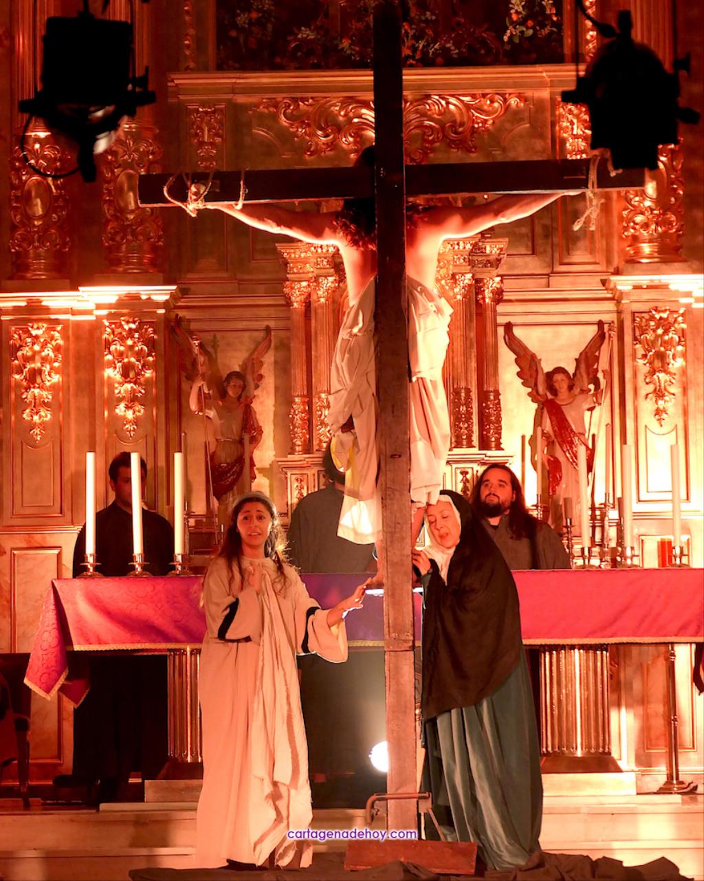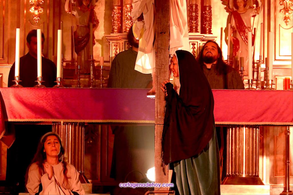 La obra, tras una alocución llevada a cabo por los actores mientras se dirigen, entre el público hacia la zona del altar, comienza con el huerto de los olivos, donde fue apresado Jesús después de ser señalado con un beso por Judas. Con unos diálogos de mucha concreción, el desarrollo continúa con la condena a ser clavado en la cruz por parte de Poncio Pilatos, los castigos y humillaciones que sufrió Cristo y su crucifixión, jalonadas las escenas por la presencia de María Magdalena, de la Verónica (limpiando su rostro) y, en especial, el dolor de su madre, María. Destacar también que la iglesia de Santo Domingo ocupó todas las localidades para ver la obra.