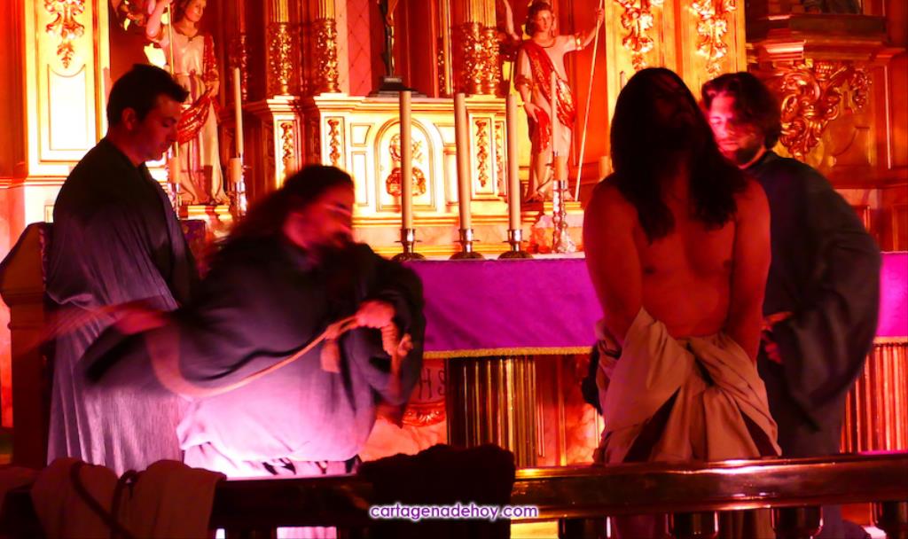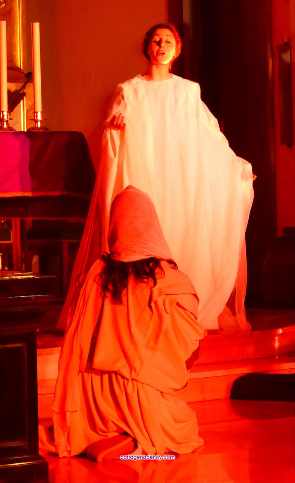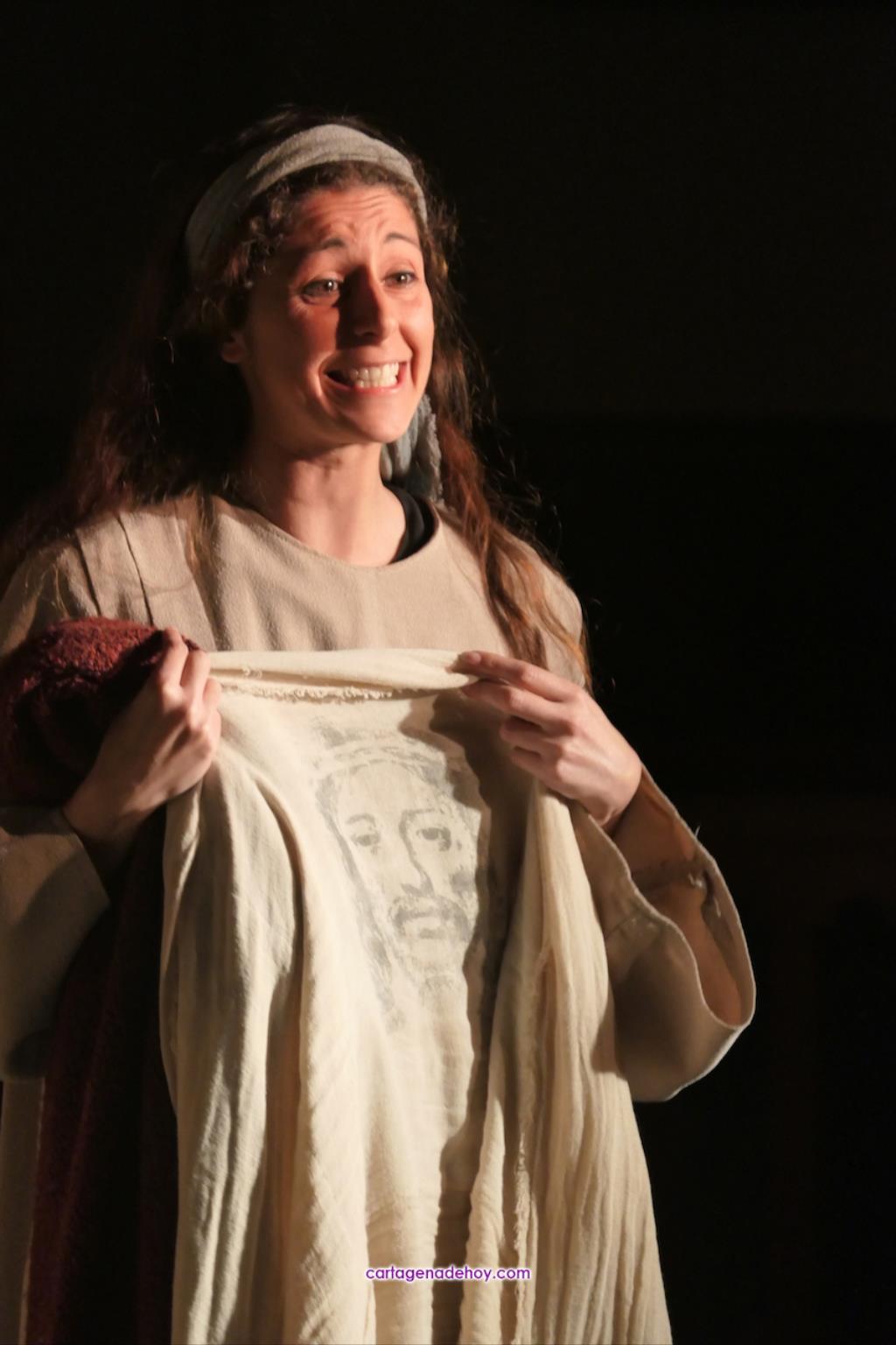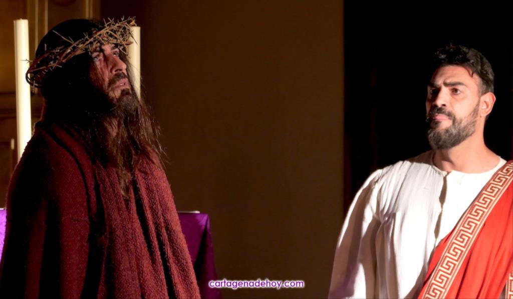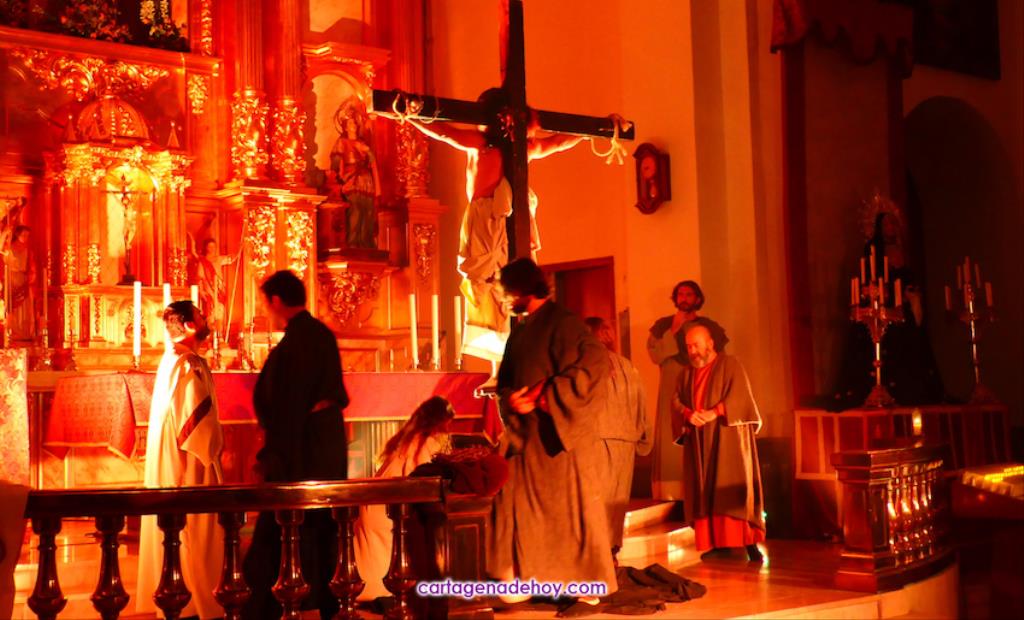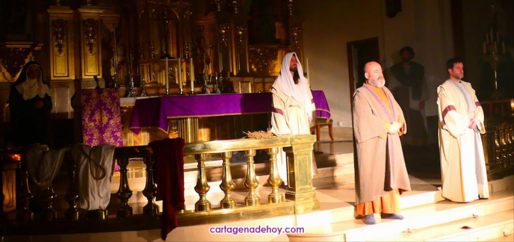 La obra, tras una alocución llevada a cabo por los actores mientras se dirigen, entre el público hacia la zona del altar, comienza con el huerto de los olivos, donde fue apresado Jesús después de ser señalado con un beso por Judas. Con unos diálogos de mucha concreción, el desarrollo continúa con la condena a ser clavado en la cruz por parte de Poncio Pilatos, los castigos y humillaciones que sufrió Cristo y su crucifixión, jalonadas las escenas por la presencia de María Magdalena, de la Verónica (limpiando su rostro) y, en especial, el dolor de su madre, María. Destacar también que la iglesia de Santo Domingo ocupó todas las localidades para ver la obra.