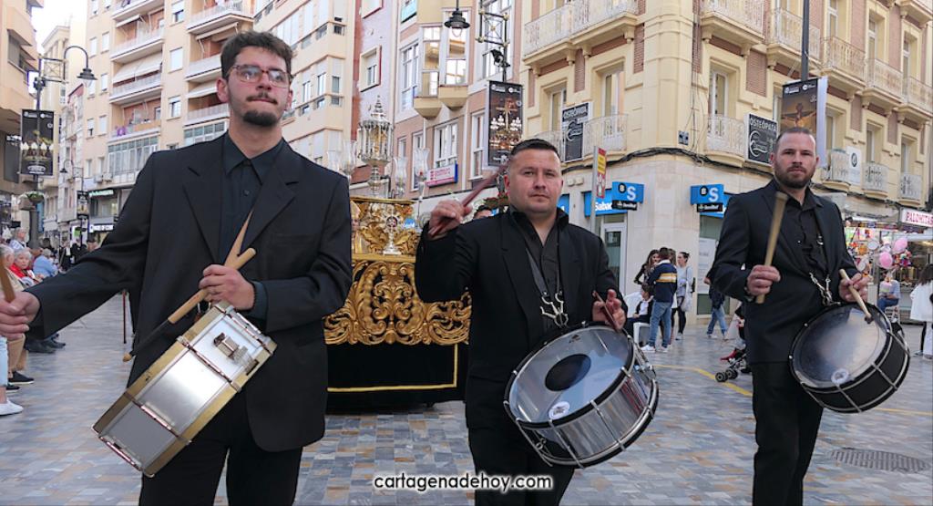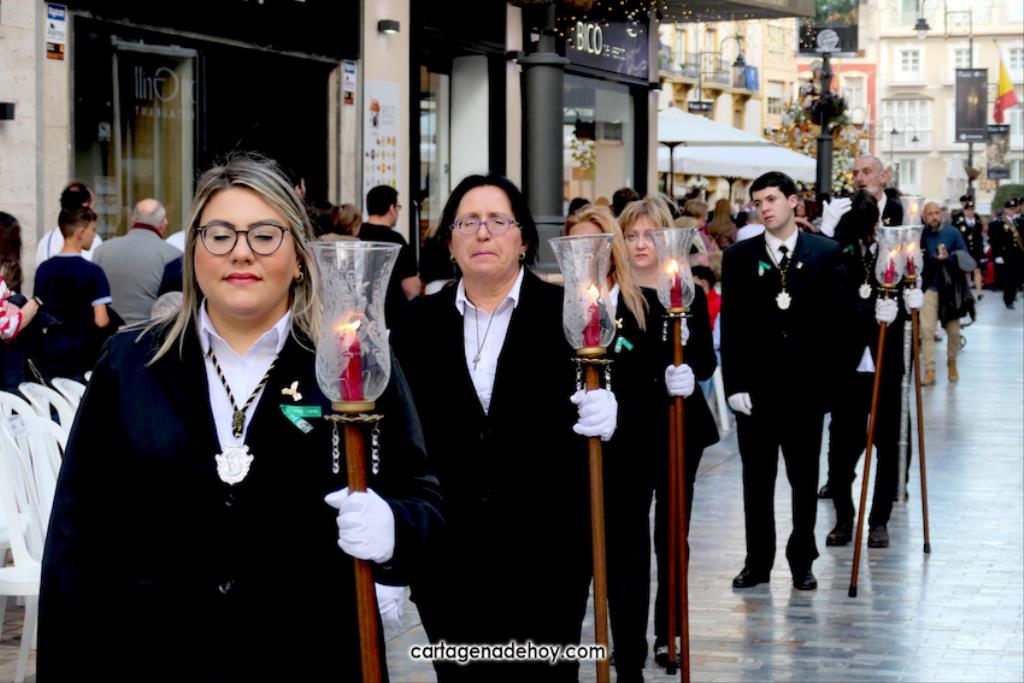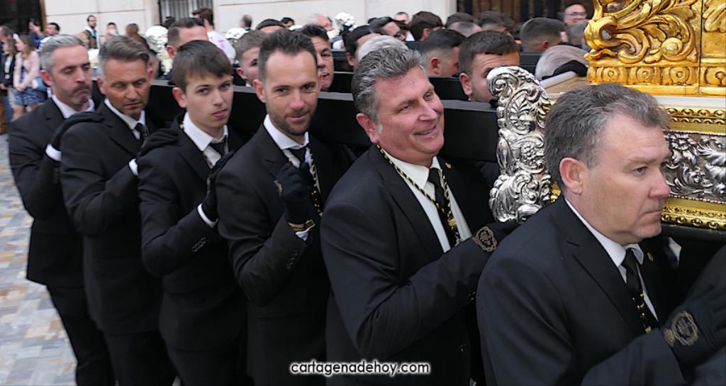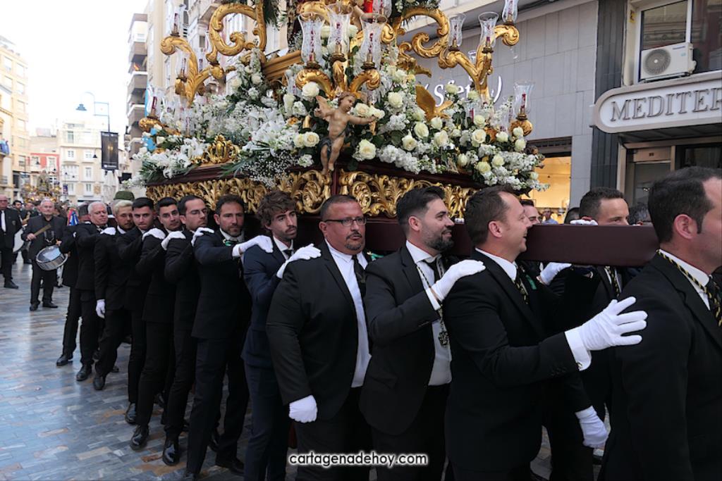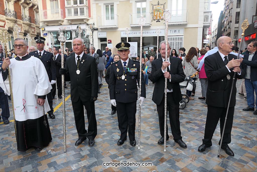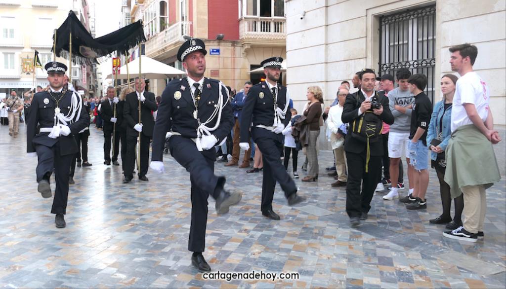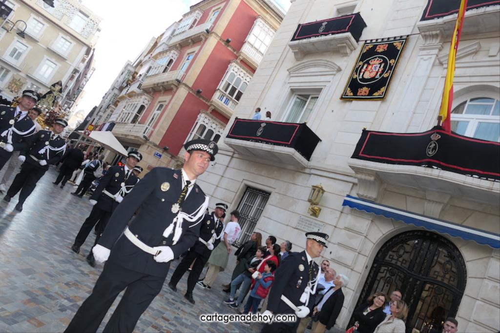 El cortejo, con predominio de trajes en negro sobre fondos blancos y desfilando como se hacía en Cartagena antes de surgir el orden procesionista, ha tenido entre sus momentos estelares el paso por la fachada de la basílica de la Virgen de la Caridad, donde el trono de Cristo ha sido elevado y encarado hacia la patrona, y la recogida final en la plaza de la Merced (‘El Lago’), donde se juntan los tres tronos y se suceden los cantos, la salve, el himno nacional, los vivas, los aplausos y los fuegos de artificio lanzados al cielo, además del acto de los difuntos en el que el escuadro de especialistas de paracaidistas del Ejército del Aire, con sede en Alcantarilla, avanza hacia el Cristo cantando ‘La muerte no es el final’.