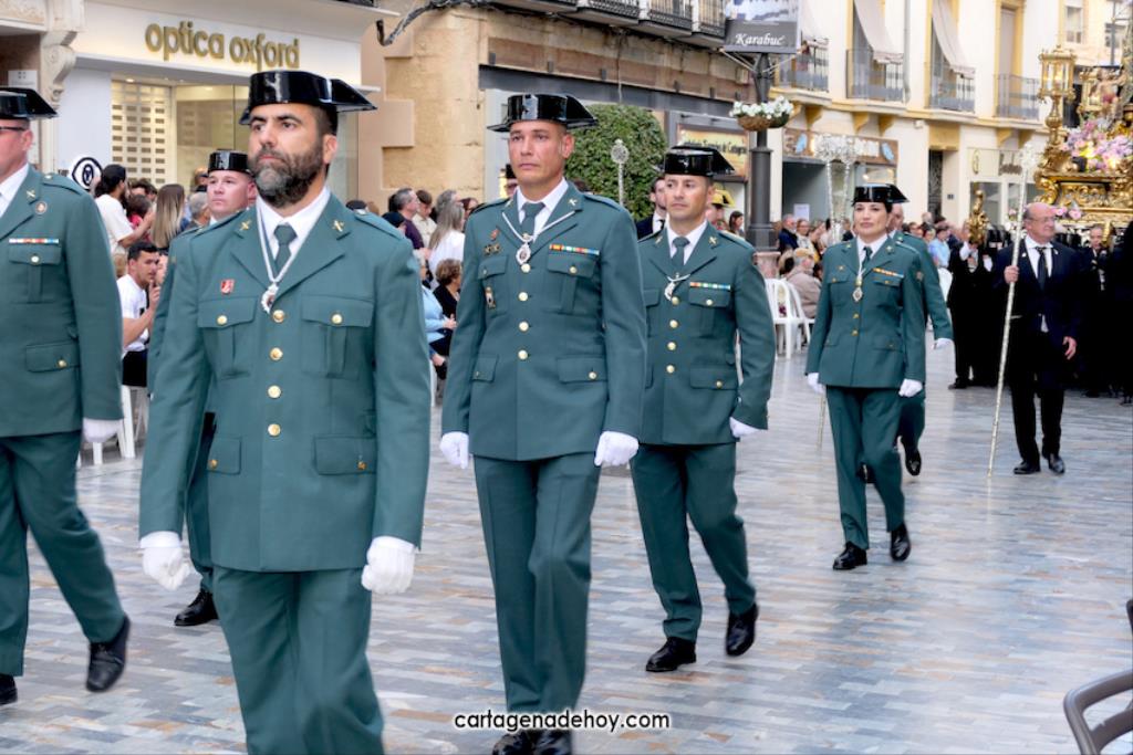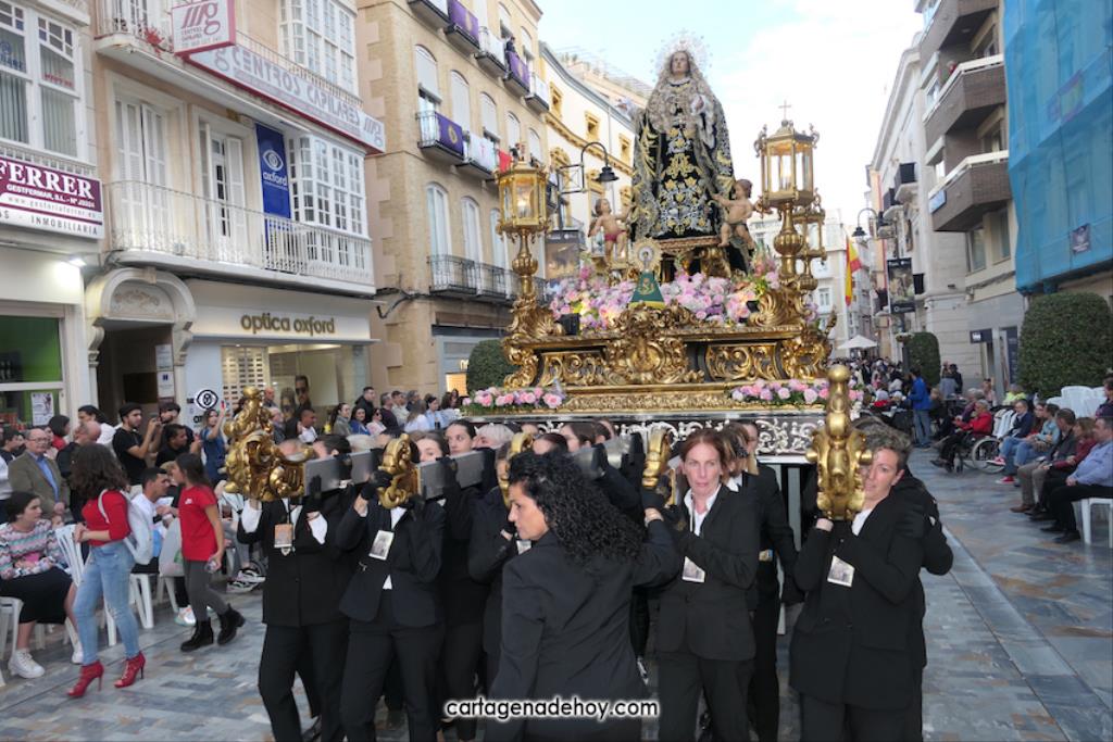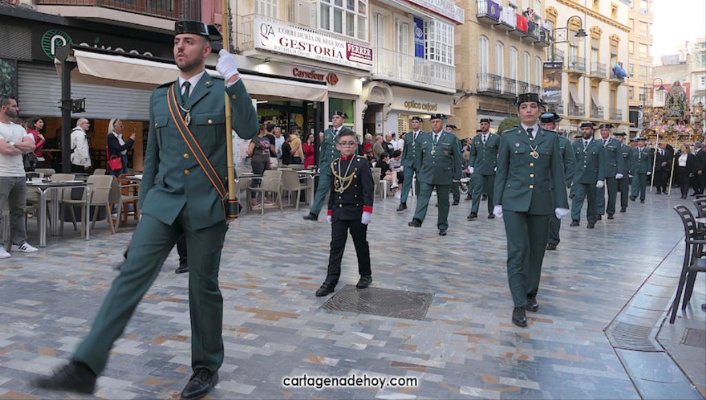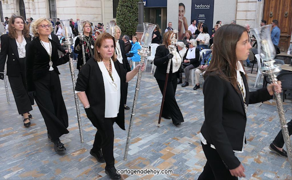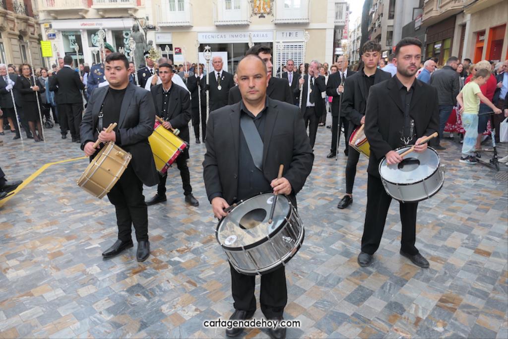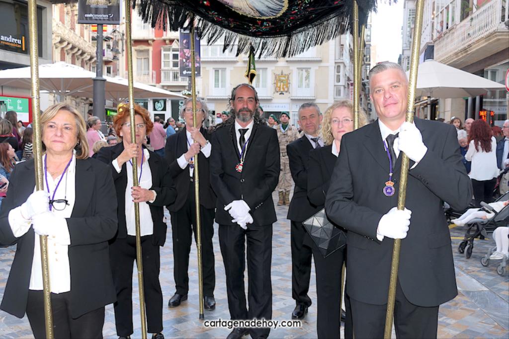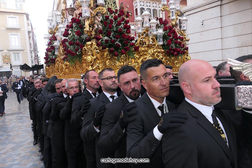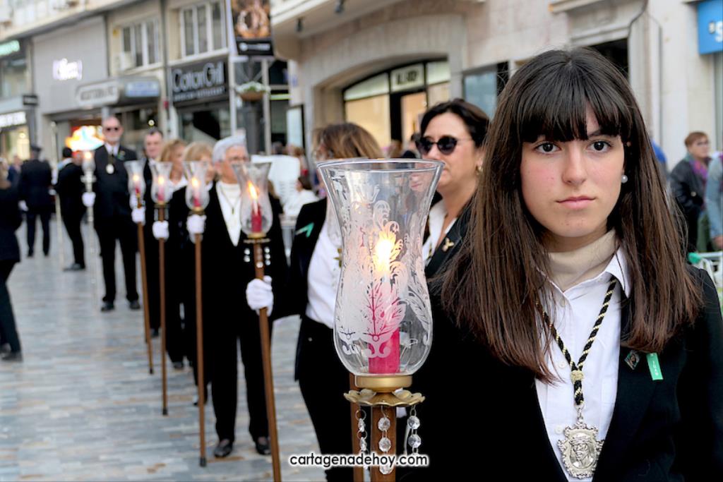 El cortejo, con predominio de trajes en negro sobre fondos blancos y desfilando como se hacía en Cartagena antes de surgir el orden procesionista, ha tenido entre sus momentos estelares el paso por la fachada de la basílica de la Virgen de la Caridad, donde el trono de Cristo ha sido elevado y encarado hacia la patrona, y la recogida final en la plaza de la Merced (‘El Lago’), donde se juntan los tres tronos y se suceden los cantos, la salve, el himno nacional, los vivas, los aplausos y los fuegos de artificio lanzados al cielo, además del acto de los difuntos en el que el escuadro de especialistas de paracaidistas del Ejército del Aire, con sede en Alcantarilla, avanza hacia el Cristo cantando ‘La muerte no es el final’.