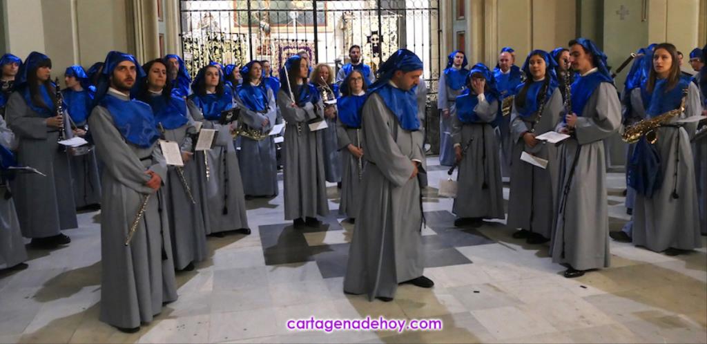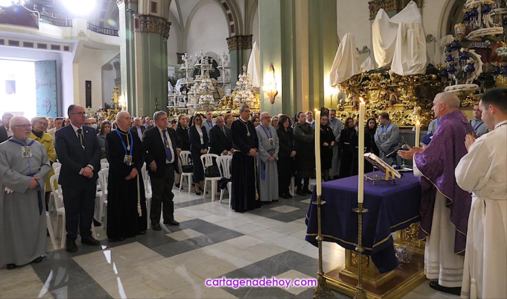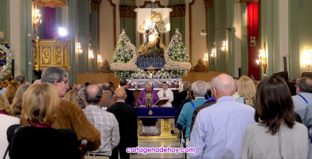 La misa fue oficiada por el capellán marrajo, Fernando Gutiérrez Reche, y su acompañamiento musical estuvo a cargo del tenor Pablo Martínez Gil y el organista Ibán Huertas San Millán, además de un canto en el ofertorio que ofreció la jienense Josefina Colmenero Escribano, segunda clasificada del certamen de saetas que organiza la agrupación con la cofradía. Por su parte, la agrupación musical Sauces interpretó la marcha 'Plegaria'. Después llegaron las fotografías de grupo de la banda de música y de los portapasos, y en los últimos preparativos para la procesión que se iba a celebrar apenas una hora más tarde, comenzando con la formación del trono.