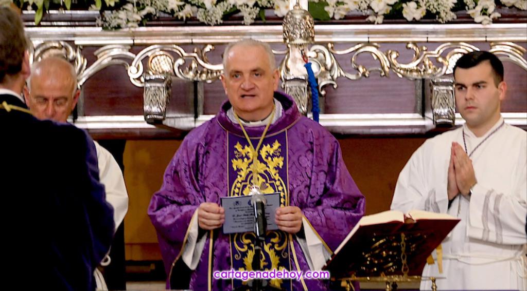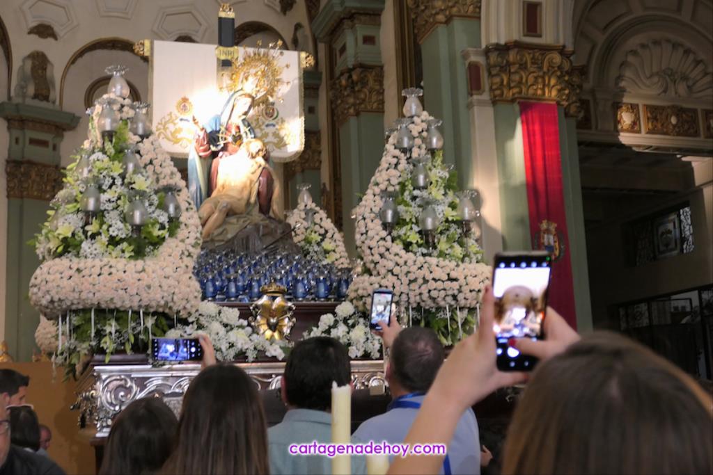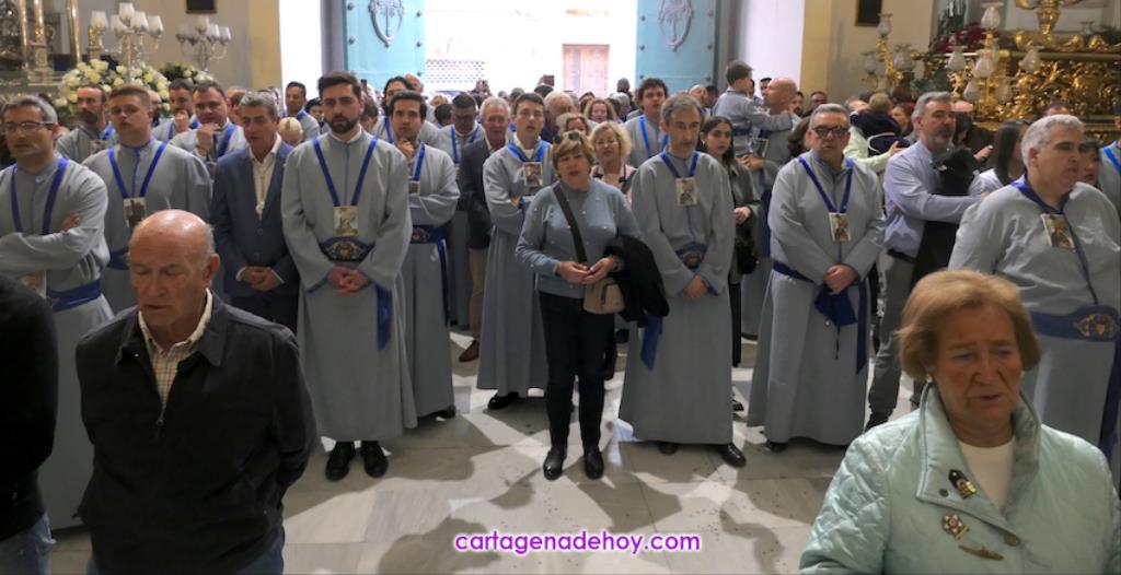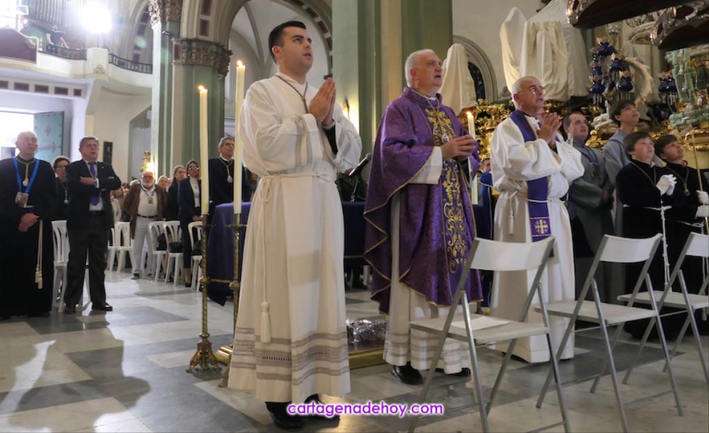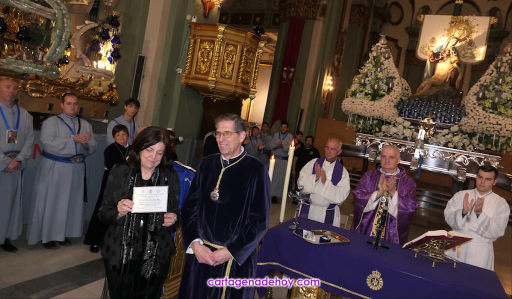 El galardón lo ha recibido en la misa celebrada por las dos agrupaciones de La Piedad en la iglesia de Santa María, oficio tradicional en la tarde del Lunes Santo, que debido a las obras en la Real Basílica Menor de la Virgen de la Caridad, ha cambiado su marco habitual, habilitándose un altar delante del trono.