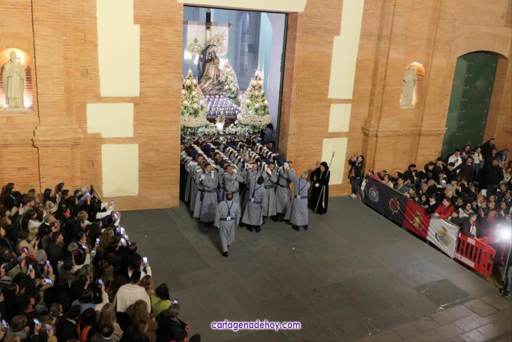 A las diez y siete minutos toda la procesión estaba en la calle. Veinte minutos después de la medianoche ha llegado el primer trono, el Cáliz, que en otro tiempo fue carro insignia de la cofradía, a Santa María. A la una menos veinte lo ha hecho la cúpula de la Caridad y a la una ha alcanzado el trono principal la emblemática rampa de la iglesia, dentro de una recogida en la que se ha ofrecido la última saeta de la noche (con la ganadora del certamen organizado fechas atrás, Ana Cayetana Atienza) y que que ha culminado con el emocionante canto de la salve cartagenera, la interpretación del himno de España, los cohetes estallando en el cielo y los momentos de mayor júbilo de la noche.