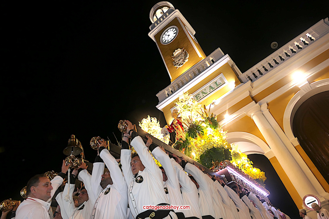 De misión en misión. Unos eligen la salida del San Juan, otros la de Santiago y muchos la de San Pedro, pero también hay quienes intentan estar en todas y los que combinan una salida con otros momentos especiales, como cuando Pedro Marina Cartagena (el nombre del DNI de quien fue el primer Papa) cruza el pórtico del Arsenal, como ver y escuchar a los portapasos santiaguistas cruzar la calle Mayor sin poner el trono en el suelo con su peculiar ‘grito de guerra’ (“¿De quién es la calle Mayor?, ¡Del Santiago!”) o cuando la punta de las varas del trono del Discípulo Amado se meten en la entrada de la Real Basílica Menor de la Virgen de la Caridad. Luego, gran parte coincide en no perderse las recogidas de las tres formaciones en Santa María. Es noche de trasiegos, diferente a las habituales de la Cartagena semanasantera, pero también cargada de emociones y alicientes.