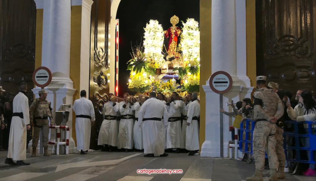 Fuerzas militares de tierra y mar arroparon a Santiago, San Juan y San Pedro en su recorrido por el casco antiguo de Cartagena ante miles de miradas de un público entregado, parte del cual llevó a cabo un trasiego de un lugar a otro para no perderse momentos especiales como la salida de los santos de sus ‘cuarteles’ o cuando los sanjuanistas metieron las puntas de las varas del trono en la basílica de la patrona (foto superior). GALERÍA DE FOTOS (pinchar aquí)
