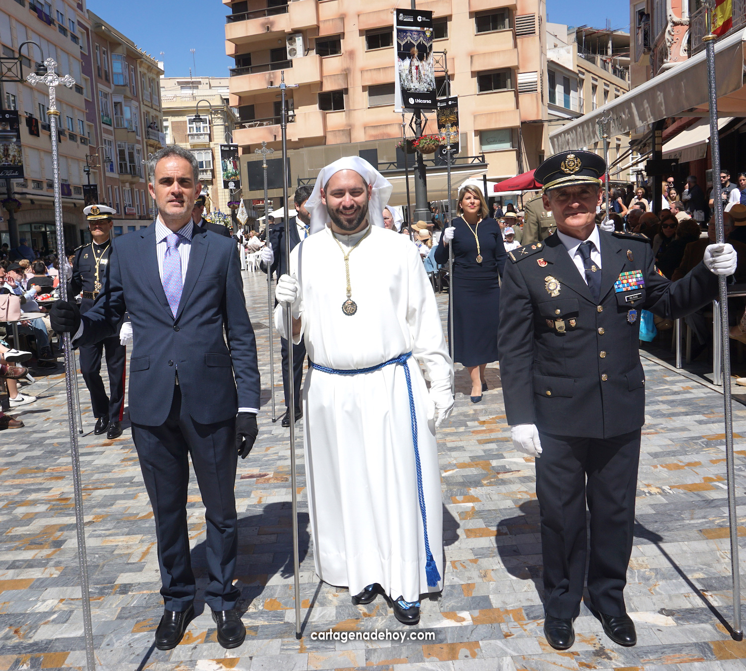 En la imagen inferior figura Del Olmo, quien actualmente es el jefe superior de la Policía Nacional en la Región de Murcia. En la superior figuran los restantes, estando a la derecha del lector Damián Romero, quien ejerce el cargo en al actualidad y que este año estrenaba nombrmaiento de ‘Hermano de honor de NP Jesús Resucitado’. Han salido en procesión dentro de la agrupación que lleva a la imagen titular del desfile y que lleva delante una escolta de agentes del 091.