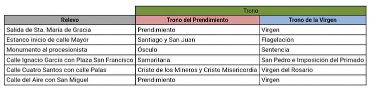 La salida de las dos andas que llevarán las imágenes será efectuadas por portapasos de las agrupaciones del Prendimiento y de la Virgen, para después llevarse a cabo relevos: