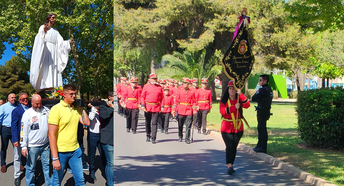 Hace 18 años tuvo lugar la primera edición del regreso de la talla central del grupo escultórico de Luis González Rey a la iglesia donde se le rinde culto fuera de Semana Santa. Dos años pandémicos (2020 y 2021) no se celebró y fue en 2022 cuando se recuperó, entonces, todavía como limitaciones sanitarias. Este año, ya con plena presencialidad, el regreso ha contado con todos los requisitos deseados de antemano, como día soleado, jornada primaveral y un estupendo acompañamiento popular a la imagen ('caminó' a hombros sobre andas) entre las antiguas galerías comerciales y la iglesia del Polígono Santa Ana, siendo la banda musical del ‘Maestro Esteban’ abría paso con su sonido dentro de una comitiva en la que iban la presidenta de la agrupación, Manoli Borrego, con su junta de mesa, y, entre otros, el hermano mayor de la Cofradía California, Juan Carlos de la Cerra. Al llegar a la parroquia, el sacerdote Cletus Padinjarenedumparambil Joseph ofició la tradicional eucaristía de campaña, con el alivio de la sombra de los pinos ubicados junto al inmueble eclesiástico.