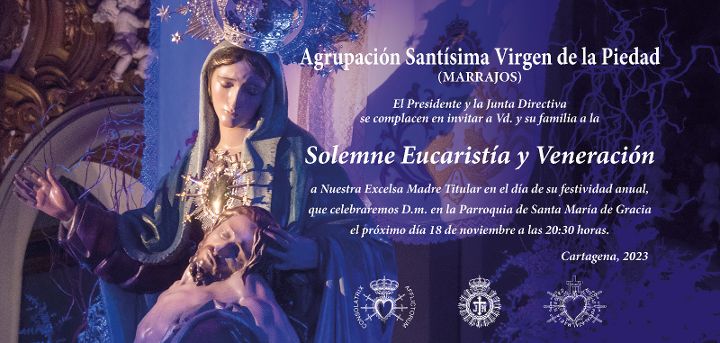 La agrupación marraja que lleva el nombre de la Virgen con su hijo fallecido en el regazo organiza este sábado, a las 20.30 horas, en la iglesia de Santa María de Cartagena la celebración de una eucaristía con posterior veneración. Cabe recordar que la talla que creó el escultor José Capuz fue trasladada en octubre al Centro de Restauración de la Región de Murcia para un estudio radiográfico.