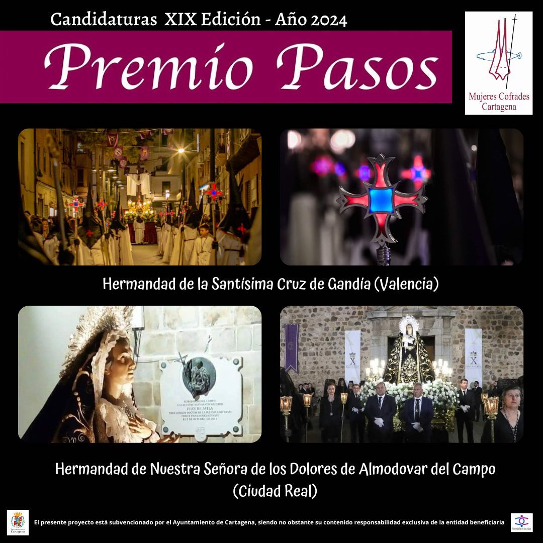 La Hermandad de la Santísima Cruz de Gandía (Valencia) y la Hermandad de Nuestra Señora de los Dolores de Almodóvar del Campo (Ciudad Real) aspiran al galardón que cada año entre la Asociación de Mujeres Cofrades de Cartagena para reconocer a aquellas entidades procesionistas que se esfuerzan en que exista una plena igualdad entre hombres y mujeres en la Semana Santa. Hoy resolverá el jurado.