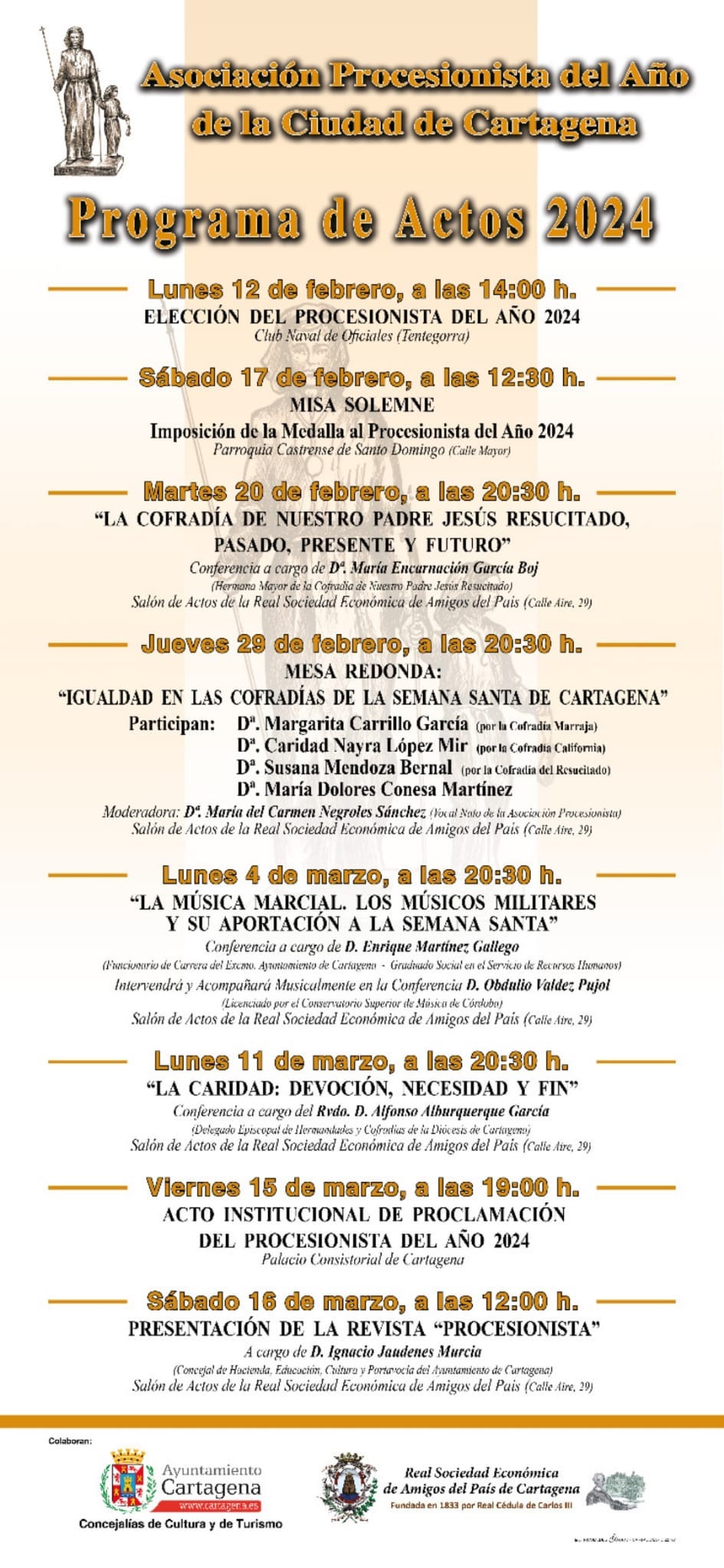 La asociación que preside Pedro Negroles comienza su programa de 2024 con la elección de su galardonado anual el 12 de febrero y hasta el 16 de marzo organiza diversas actividades relacionadas con el premio, además de una misa solemne, la presentació de su revista, ponencias (Enrique Martínez, Alfonso Alburquerque y Marien García Boj) y una encuentro de tres cofradías para abordar cómo está la igualdad entre hombres y mujeres en las hermandades de la Semana Santa de Cartagena.