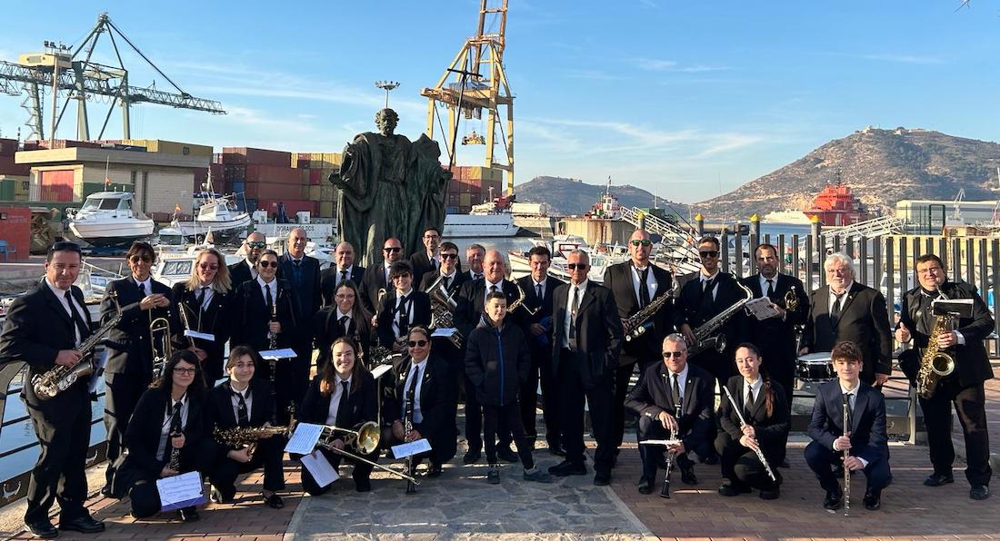 La agrupación musical 'Cartagena 1990' ha sido la banda encargada de poner la música en la llegada a la dársena del puerto de Santa Lucía de la 'luz' del 'XIII Encuentro diocesano de jóvenes cofrades', además de sus posterior traslado a la plaza del Ayuntamiento.