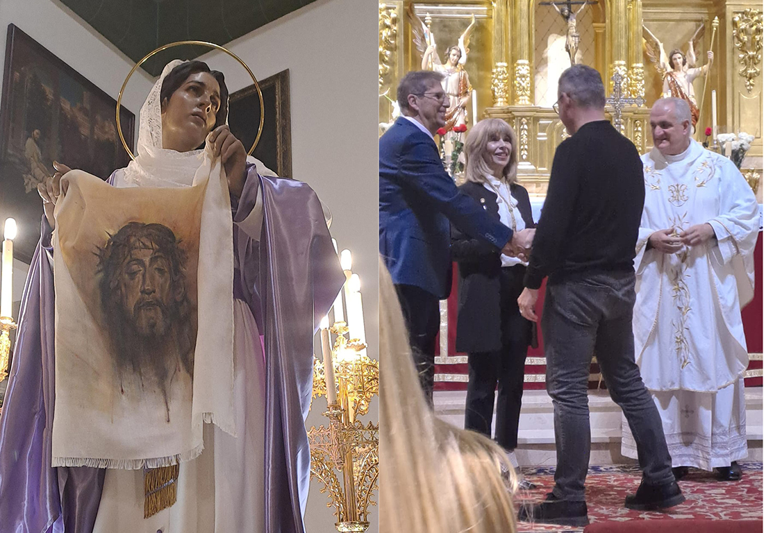 La misa, con la imagen de la Verónica junto al altar, fue oficiada por Fernando Gutiérrez Reche, capellán marrajo y pregonero de la Semana Santa de Cartagena 2024. La entrega fue llevada a cabo por el hermano mayor de la Cofradía de Jesús Nazareno, Francisco Pagán, y la presidenta de la Agrupación de la Verónica y Santa Faz de Cristo, Caridad Conesa.