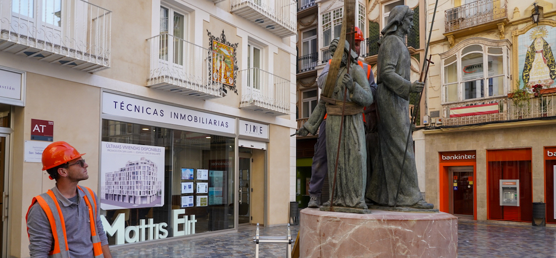 El pequeño procesionista de la obra ubicada en la obra de Manuel Ardil Pagán de la plaza de San Sebastián ha sido instalada hoy tras estar ausente unos días para ser subsanados en un taller los pequeños daños que presentaba.