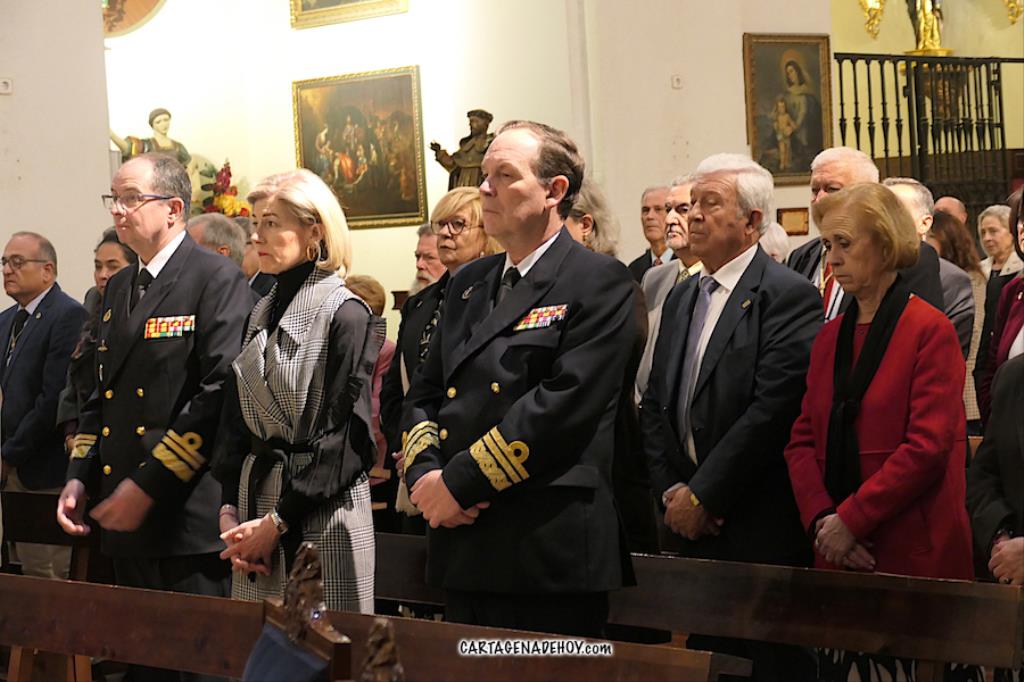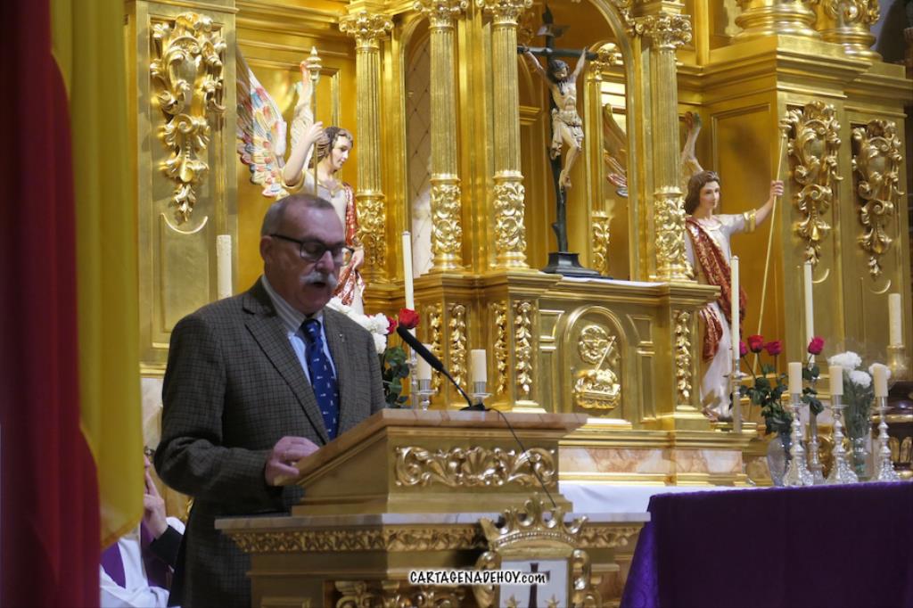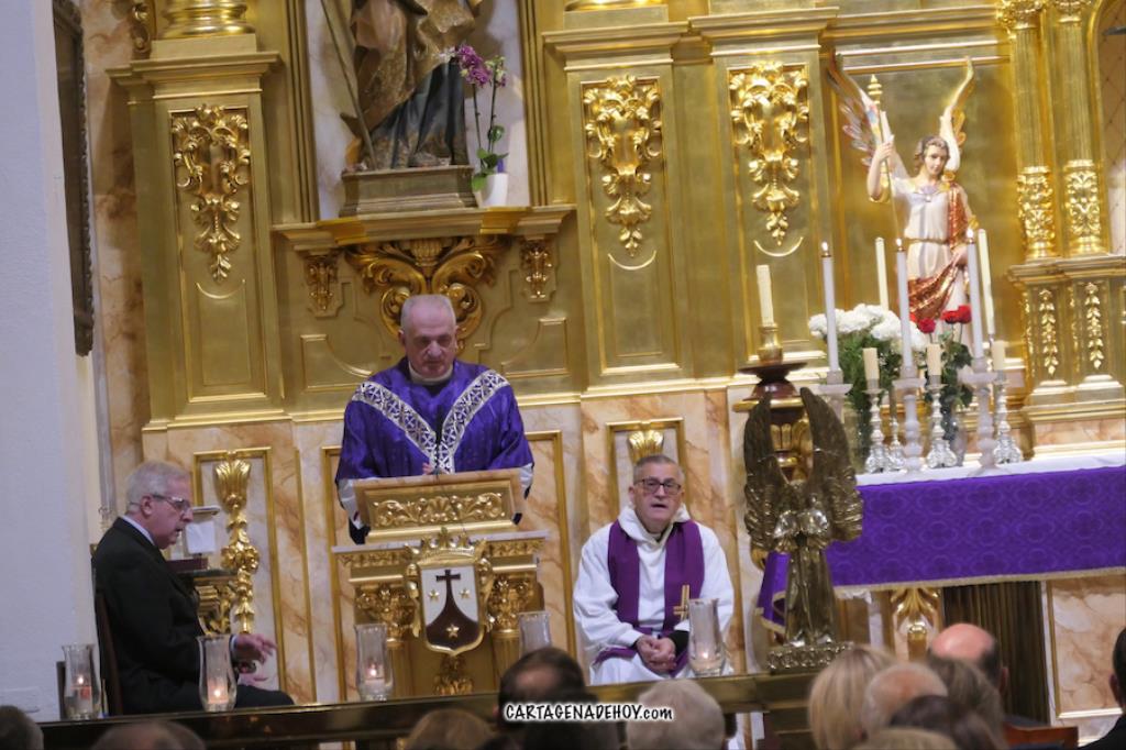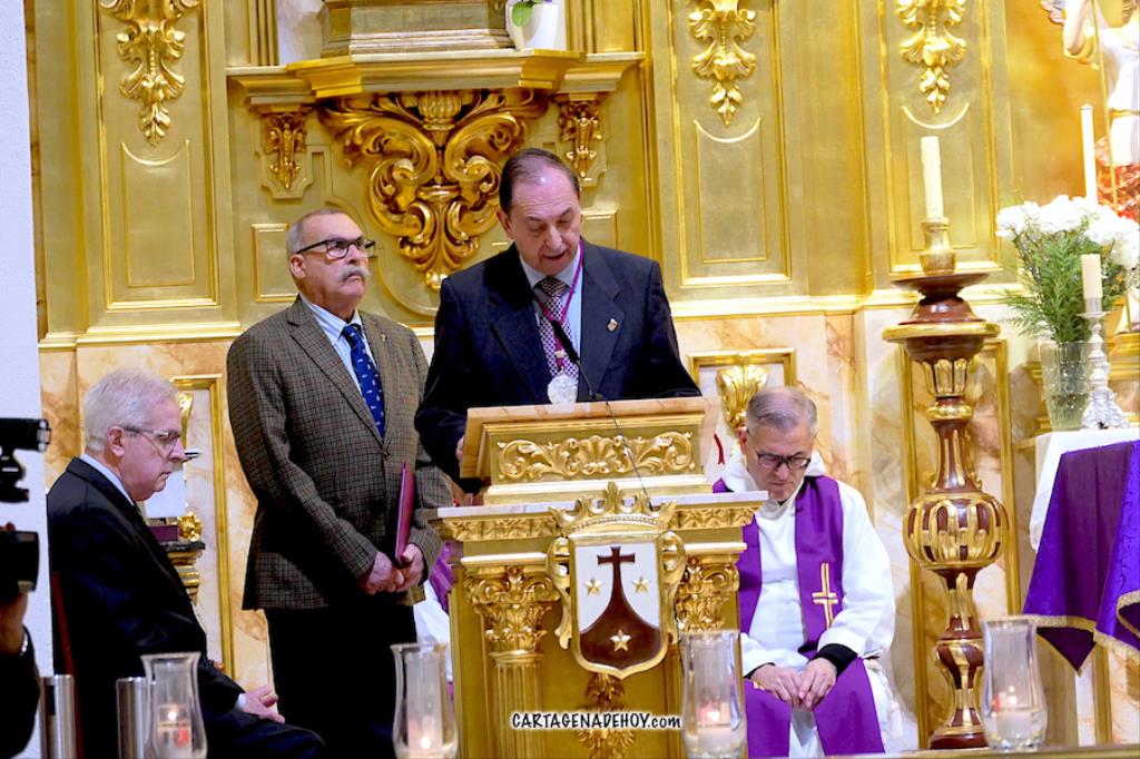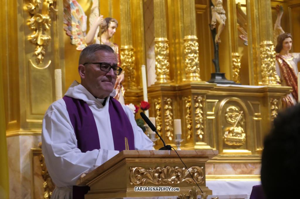La iglesia castrense de la calle Mayor de Cartagena ha acogido esta mañana la celebración de una misa presidida por Fernando Gutiérrez Reche, capellán de la Cofradía Marraja y vinculado al Cristo del Socorro, quien por la tarde ha ofrecido el pregón de la Semana Santa de Cartagena'24. El sacerdote, en su alocución, se ha referido a los cofrades, diciendo que un procesionista "no debe quedarse en la tristeza del Viernes Santo, sino en el gozoso Domingo de Resurrección" y que la cuaresma son cuarenta días "para acercanos al Señor. Quizás en Cartagena, con tantas fiestas, se nos olvida ese sentido de la cuaresma". Después se ha centrado en Manuel Martínez, 'Procesonista del Año', de quien ha indicado que es merecida la distinción, recordando que recibió el agua bautismal y que, a partir de ahí, "la semilla fue creciendo y siempre ha querido caminar como hijo de la iglesia. No es un santo, pero hombre bueno es, hombre de fe, buen esposo y que ha querido transmitir la fe, y de quien nos consta su amor a la Iglesia y su ata participación en la eucaristía", ha indicado, además de hacer mención a su labor como hermano mayor de la Cofradía del Cristo del Socorro.