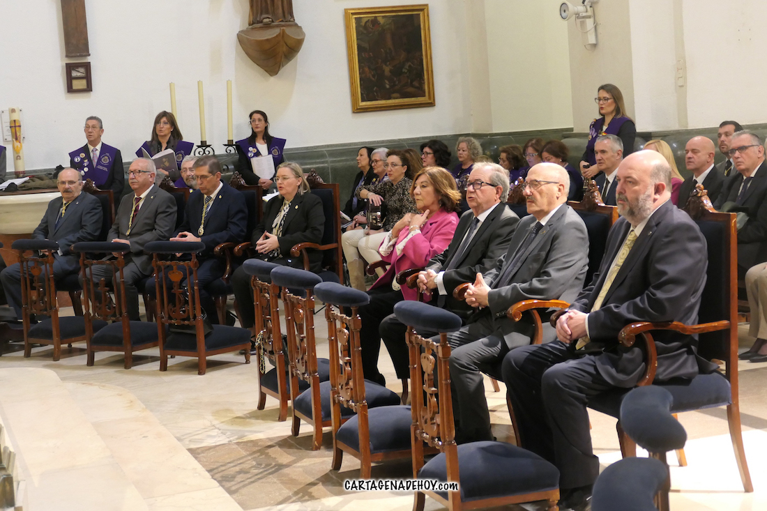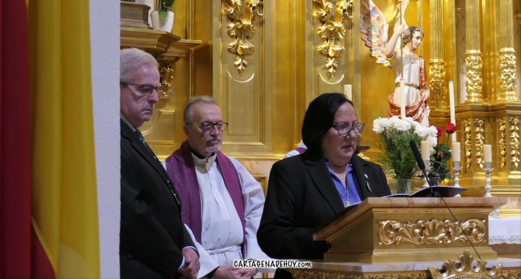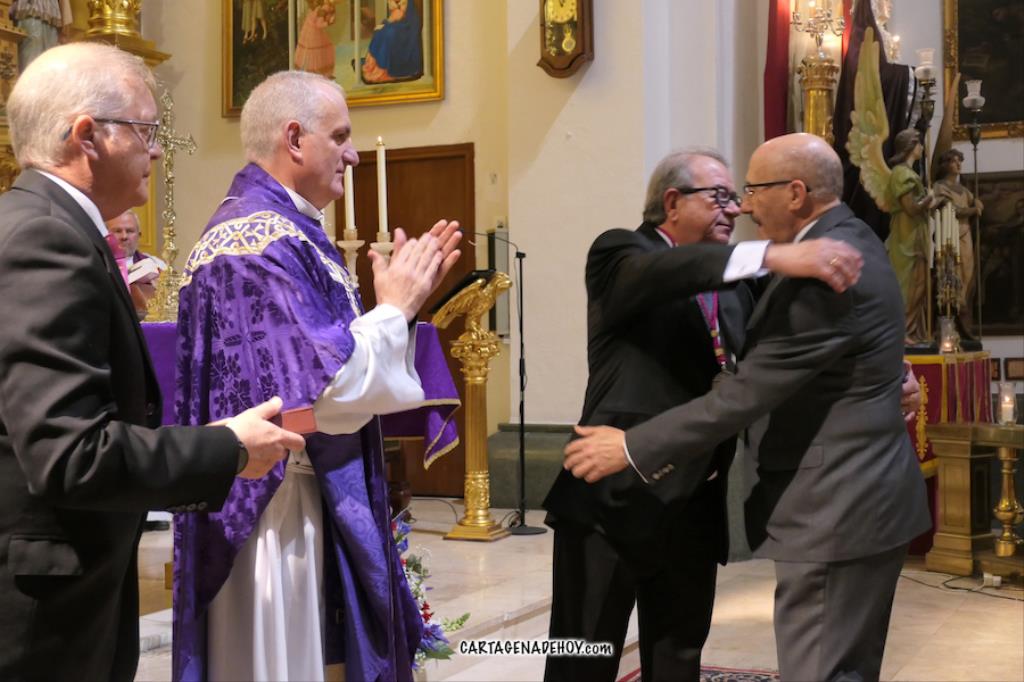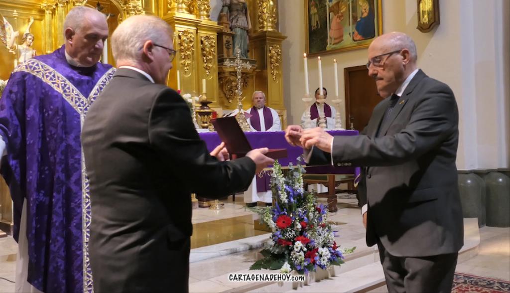 A continuación, Pedro Negroles, como presidente de la asociación Premio Procesionista del Año, le ha impuesto la medalla ante la mirada de medio centenar de personas en una iglesia que ha contado con la presencia de los cuatro hermanos mayores de las principales cofradías pasionarias de la ciudad, de la 'Nazarena mayor' y del edil Pablo Braquehais, entre otros, entre los que se incluyen los dos almirantes de Cartagena, motivo por el que la iglesia ha contado con policía naval en ambas entradas debido a la situación de alerta en la que se encuentra España.