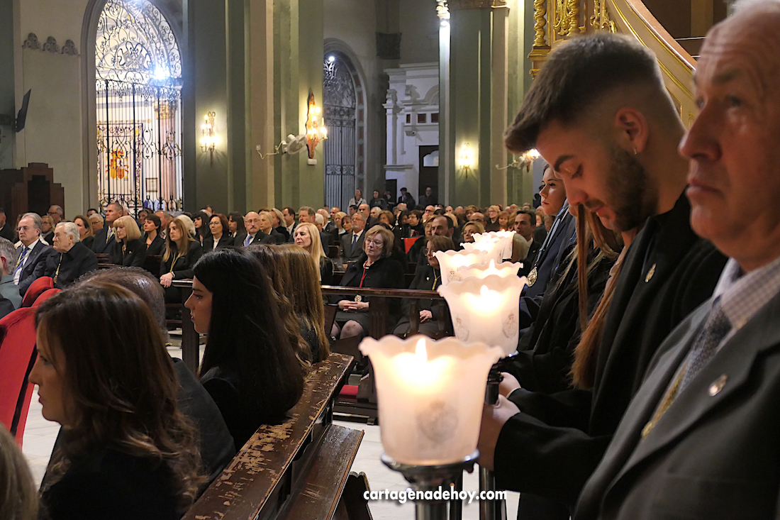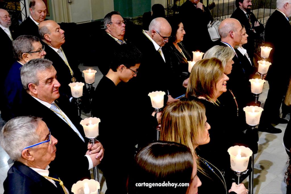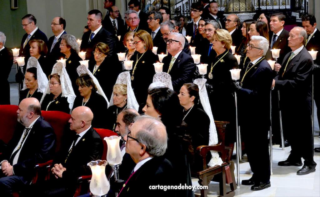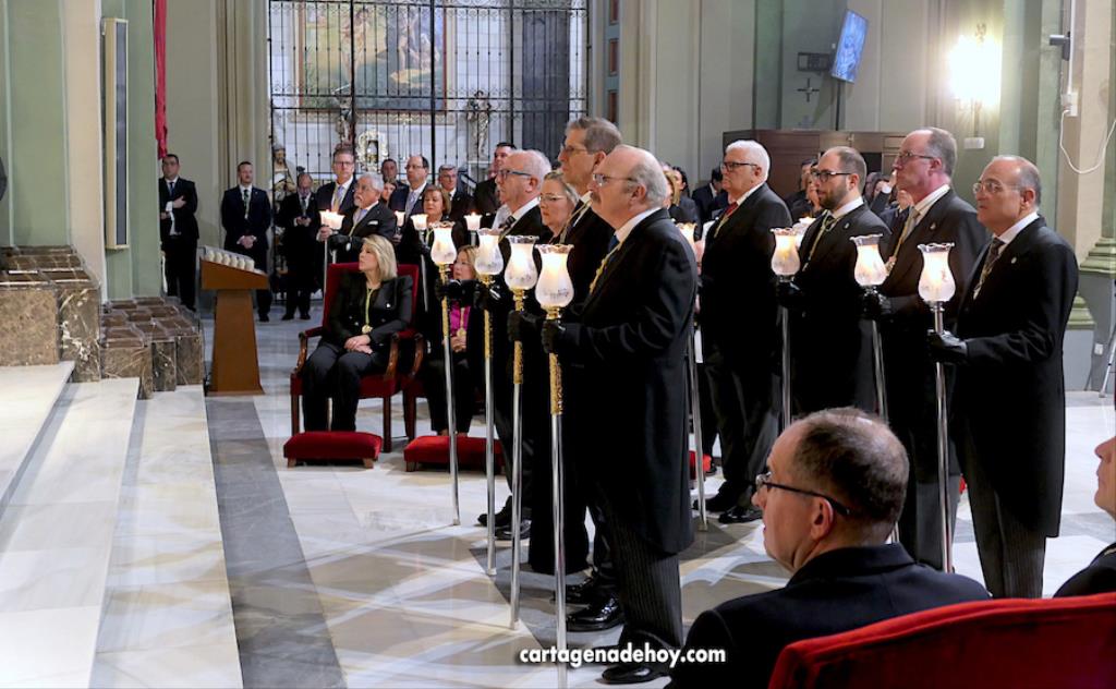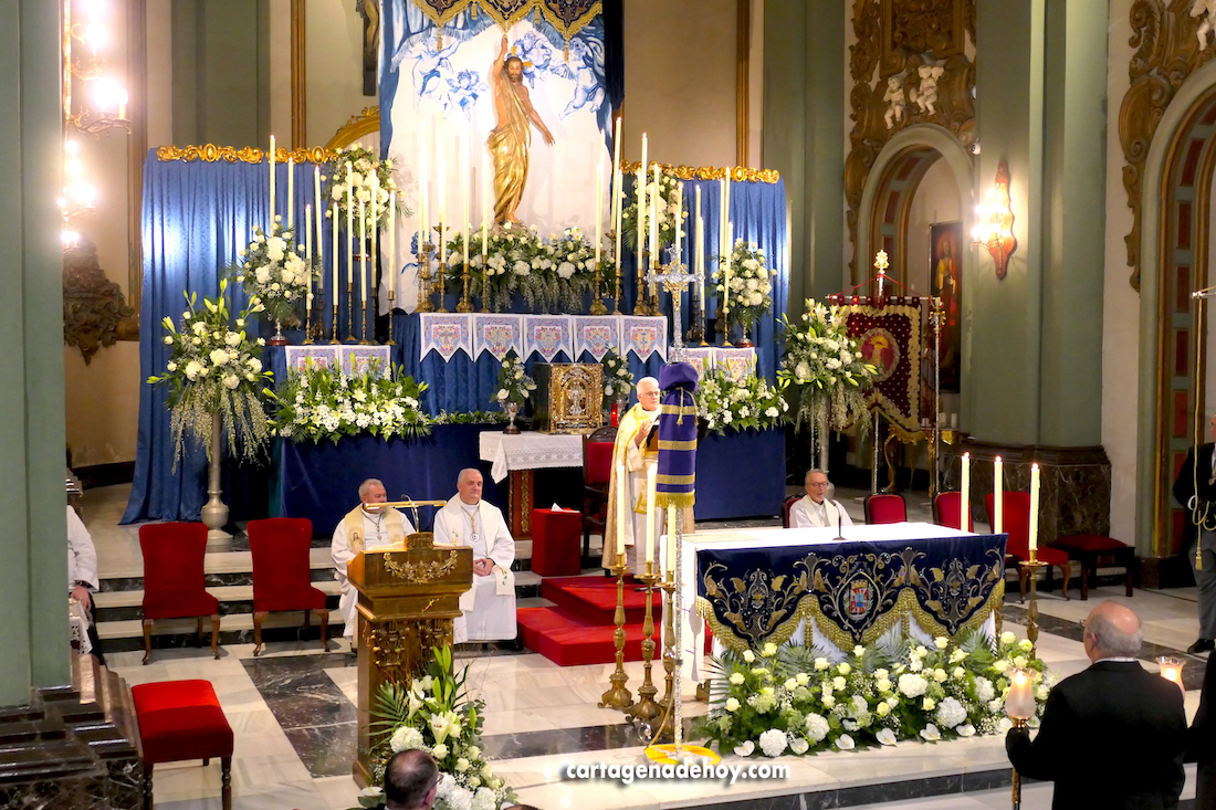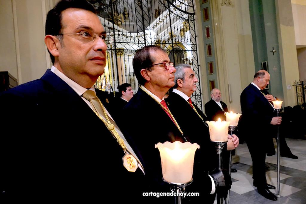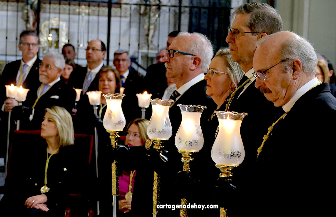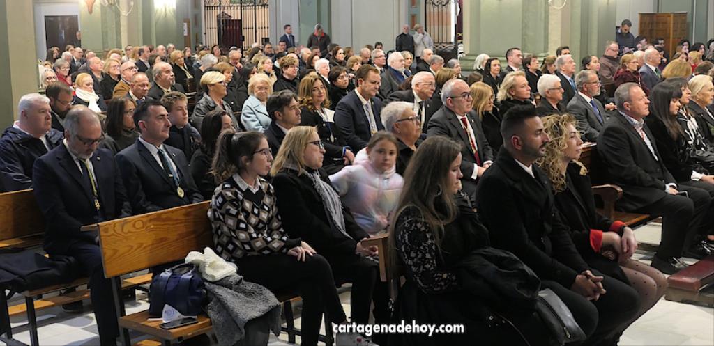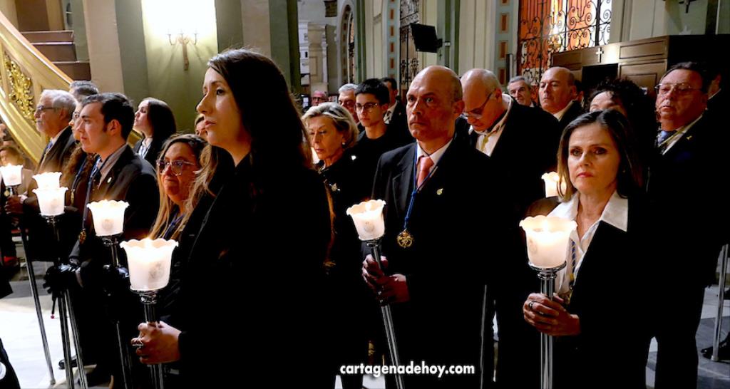 Además de la presencia de los capellanes de las otras tres cofradías principales de Cartagena, destacar el enriquecimiento musical a cargo de un coro y de la Agrupación Musical Cartagonova. También queremos reseñar el dato de la asistencia de la alcaldesa, Noelia Arroyo, entre otras autoridades civiles y militares, además de decenas de procesionistas que se ubicaron ante un altar adornado con muy buen gusto, a base de flores y elementos resucitados, en torno a la figura de Jesús que creó González Moreno.