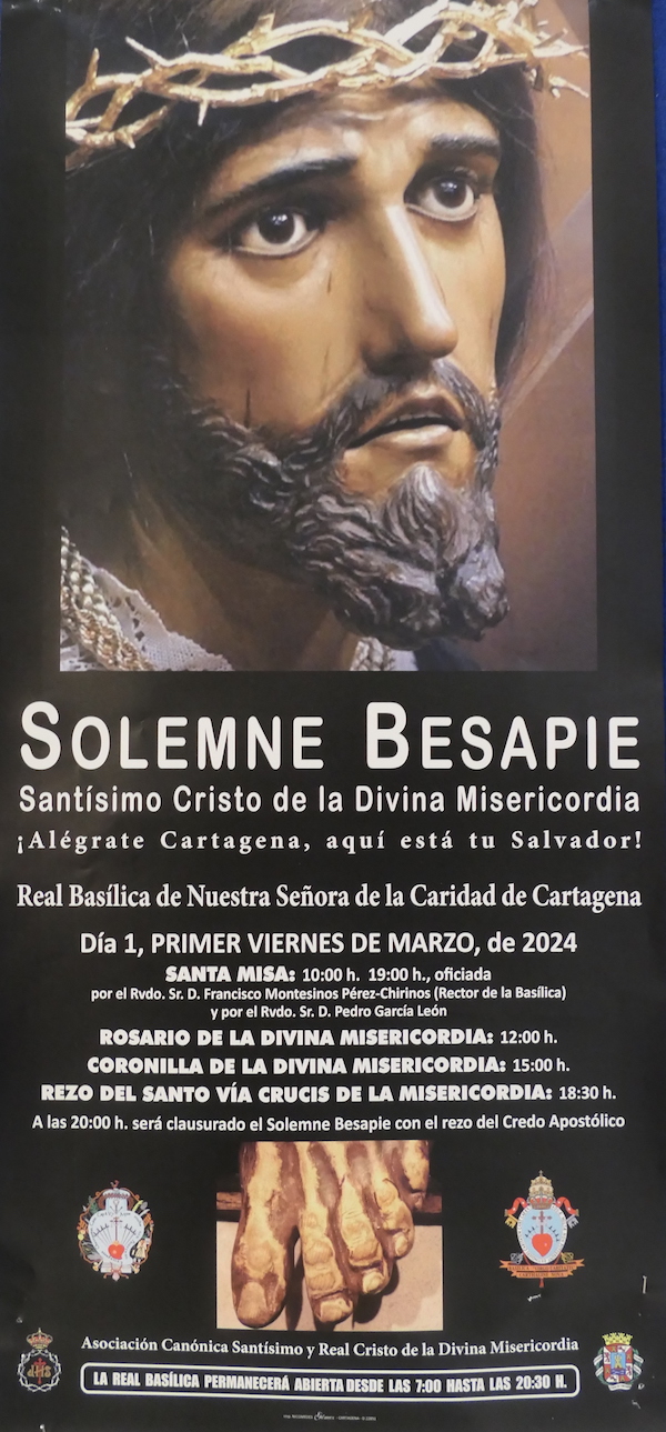 La capilla anexa de la Real Basílica Menor de la Virgen de la Caridad, que estará abeirta desde las siete de la mañana hasta las ocho y media de la noche, acoge este viernes el acto de veneración del Santísimo Cristo de la Divina Misericordia, que culminará con el rezo del credo apostólico.