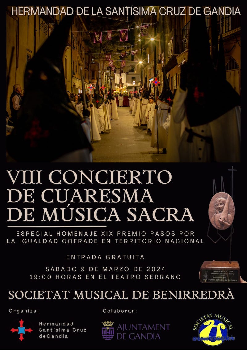 La Hermandad de la Santísima Cruz de la localidad valenciana, ganadora de la XIX edición del galardón que otorga la Asociación de Mujeres Cofrades de Cartagena a aquellos colectivos cofrades (no locales) que trabajan por a plena igualdad de hombre y mujeres en la Semana Santa, rendirá un especial homenaje a esta distinción en su concierto anual de cuaresma, que celebrarán el próximo 9 de marzo.