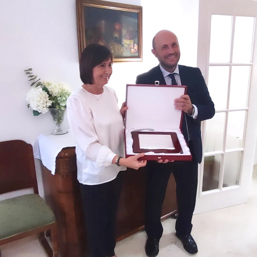 María del Carmen López Fraga es la nueva camarera de la agrupación de Santiago Apóstol, nombramiento oficial que le comunicó en su domicilio el presidente del colectivo santiaguista, Manuel Salmerón Fuentes, quien le entregó una placa conmemorativa junto a un ramo de flores.