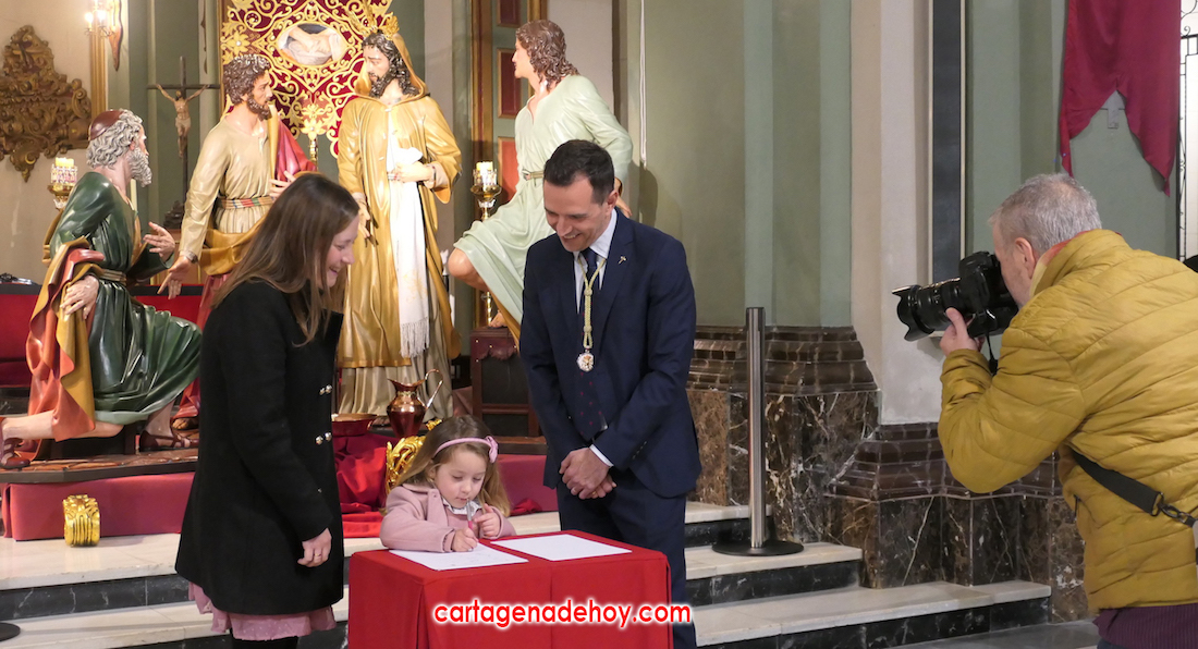 A continuación se ha llevado a cabo la firma del acta fundacional de un paso que será exclusivamente femenino, cuyas rúbricas han estampado el hermano mayor californio, Pedro Ayala; el presidente santiaguista, Manuel Salmerón Fuentes; y los presidentes honoríficos José Pando y Manuel Salmerón Martínez, que también han sido quienes han descubierto las cuatro tallas creadas por el imaginero Francisco Romero Zafra, artista de La Victoria (Córdoba), quien no ha podido estar presente, emitiéndose un vídeo grabado en su taller.