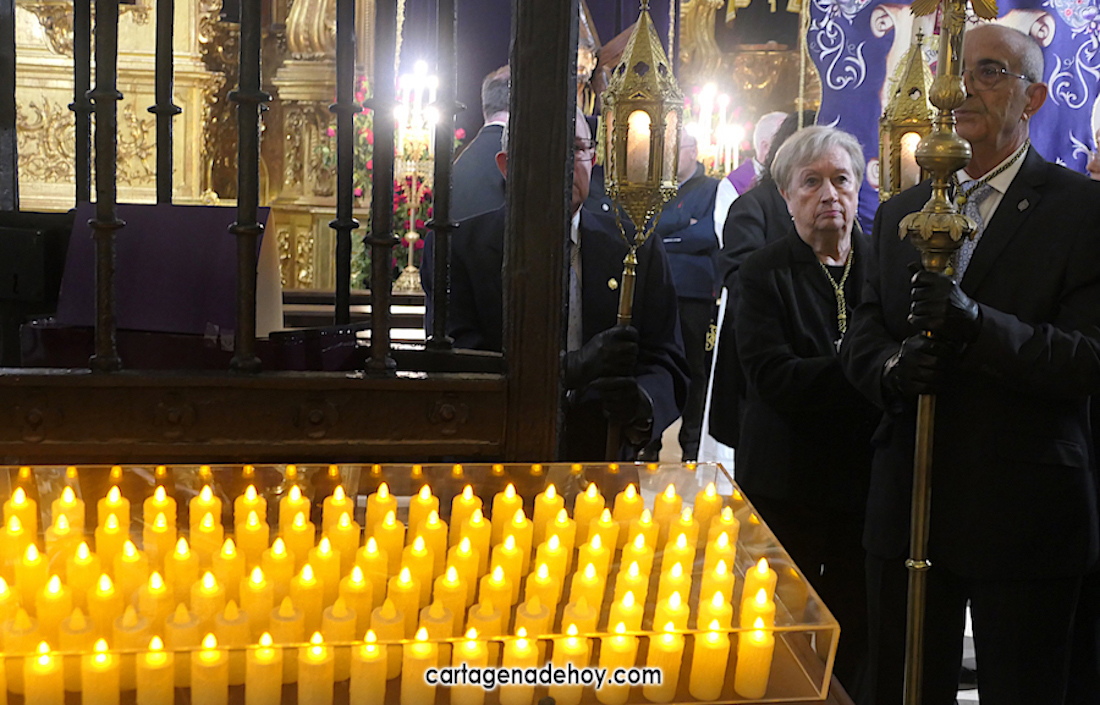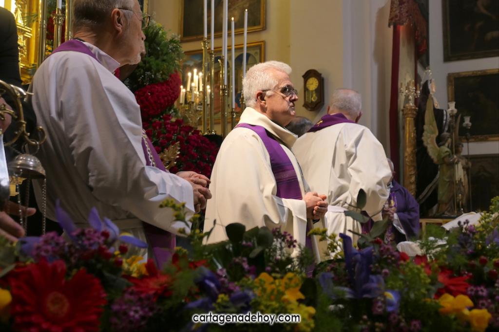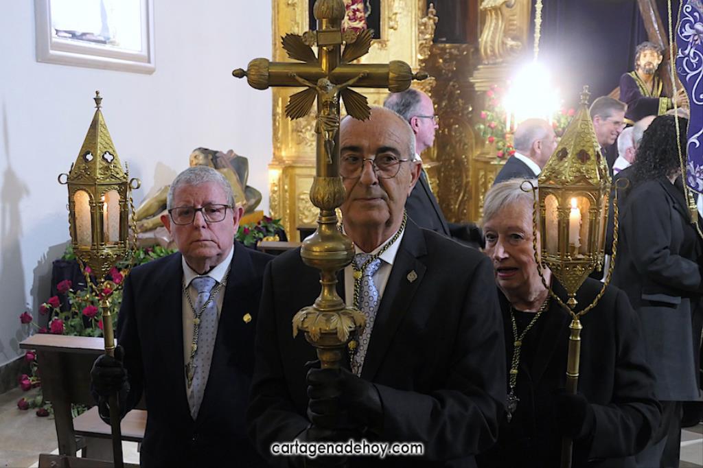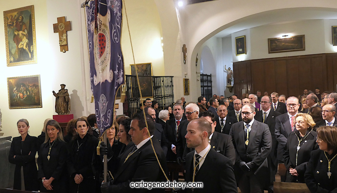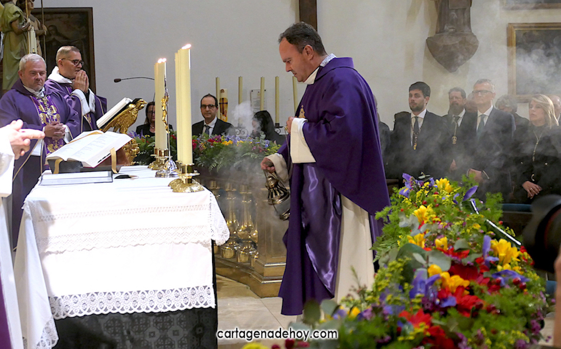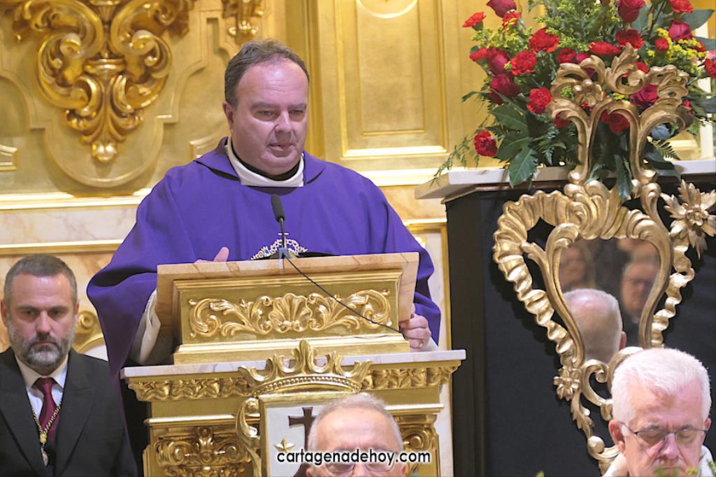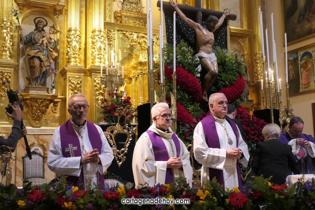 Alfonso Alburquerque García ha sido el encargado este año de presidir la ceremonia celebrada con participación de los capellanes de las cuatro principales cofradías pasionarias de Cartagena. El delegado de Hermandades y Cofradías de la diócesis de Cartagena ha reiterado el "Venid a mí" que Jesús expresó cuando estaba crucificado exponiendo que atender esa llamada ayudar a superar "la falta de esperanza que desquicia muchos", apuntando que, especialmente cuando hay dolor o preocupación, "acudimos a Él, pedimos que sea nuestro socorro".