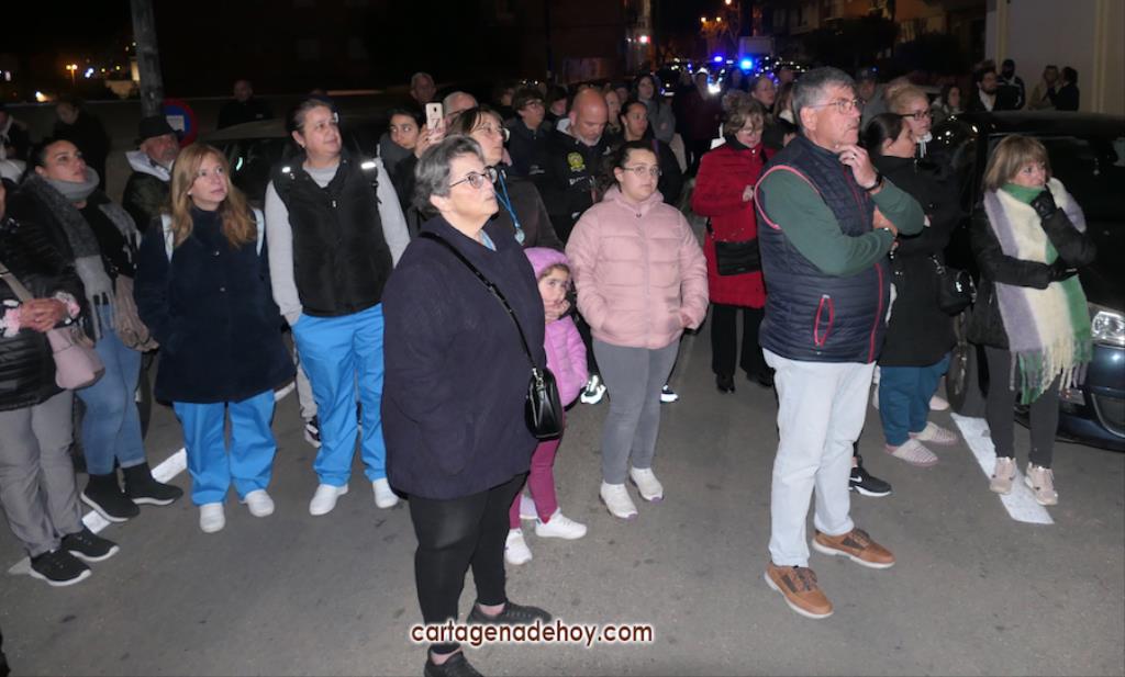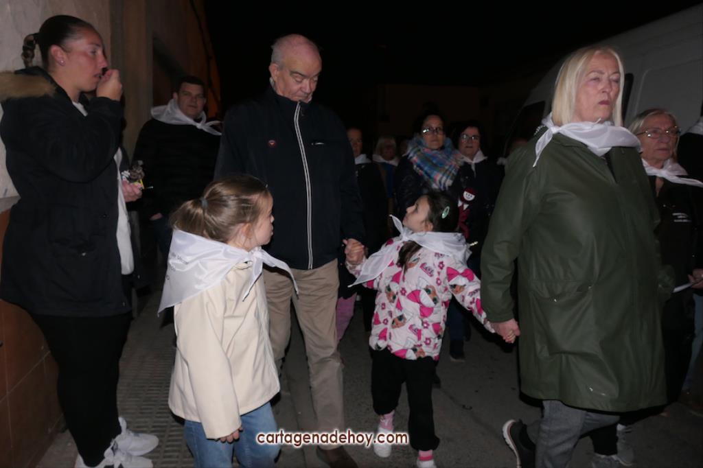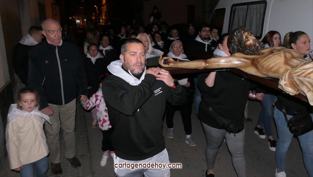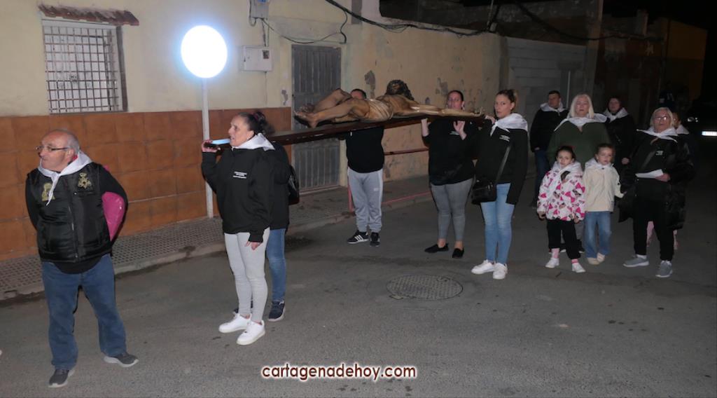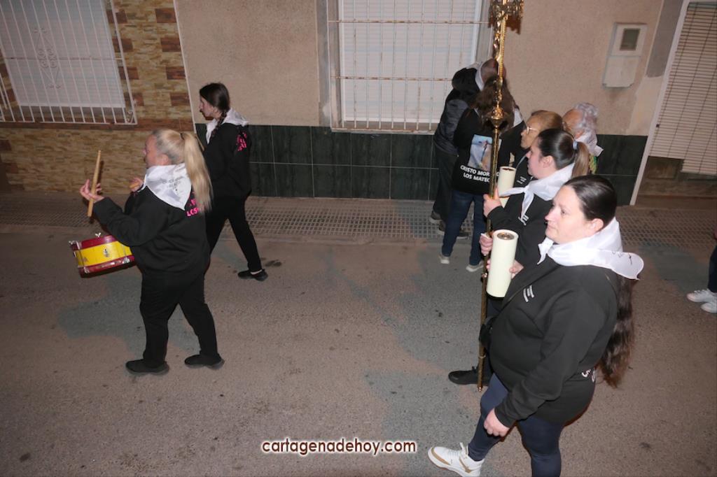 Siete y media de la tarde. Hace mucho frío en lo alto del cerro de los Moros, pero la ilusión lo supera. Ahí está el Cristo Moreno de Los Mateos con sus fieles, bastantes de los cuales lucen pañuelas y polos para la ocasión con leyenda alusiva a su fidelidad al crucificado. Comienza el descenso por las calles de Santa Lucía a golpe de tambor por las oscuras vías por su escasa iluminación, lo que potencia el recogimiento.