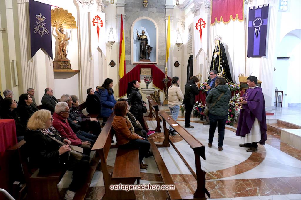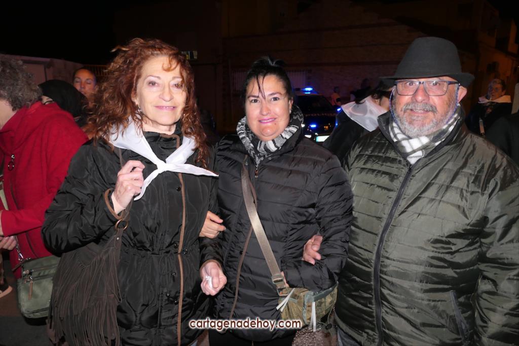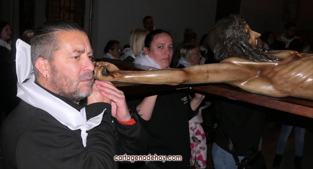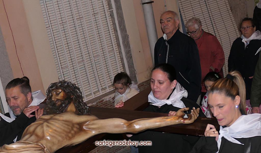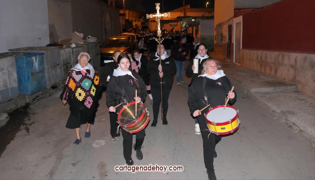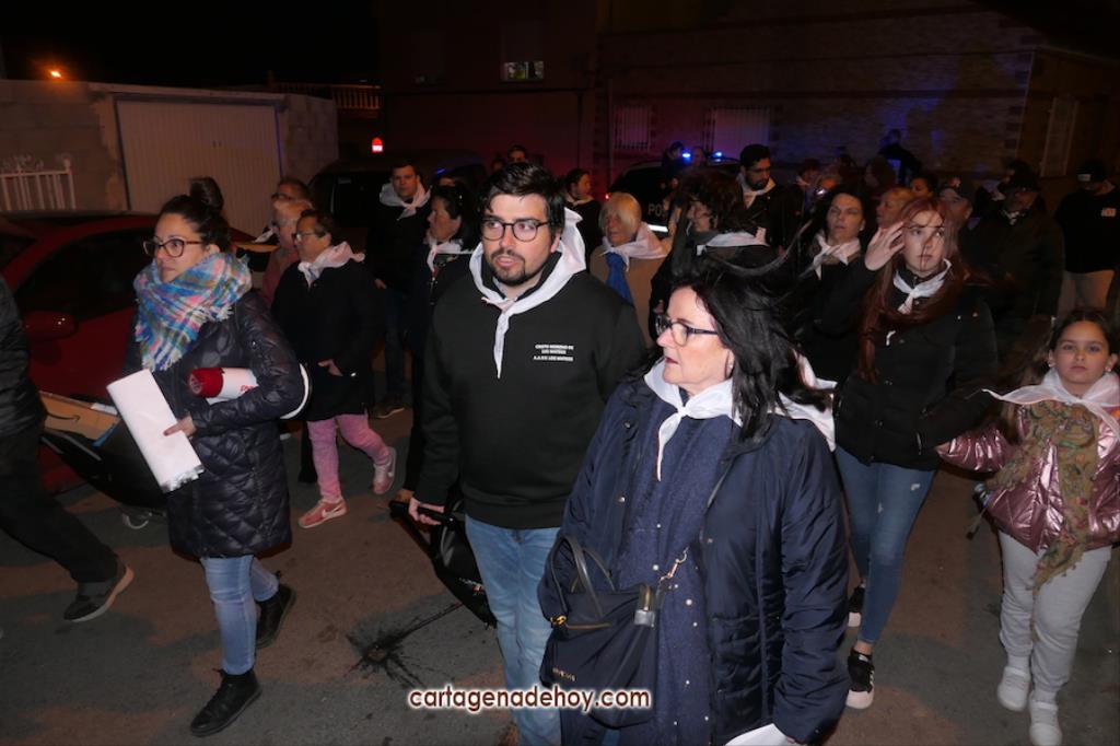 Siete y media de la tarde. Hace mucho frío en lo alto del cerro de los Moros, pero la ilusión lo supera. Ahí está el Cristo Moreno de Los Mateos con sus fieles, bastantes de los cuales lucen pañuelas y polos para la ocasión con leyenda alusiva a su fidelidad al crucificado. Comienza el descenso por las calles de Santa Lucía a golpe de tambor por las oscuras vías por su escasa iluminación, lo que potencia el recogimiento.