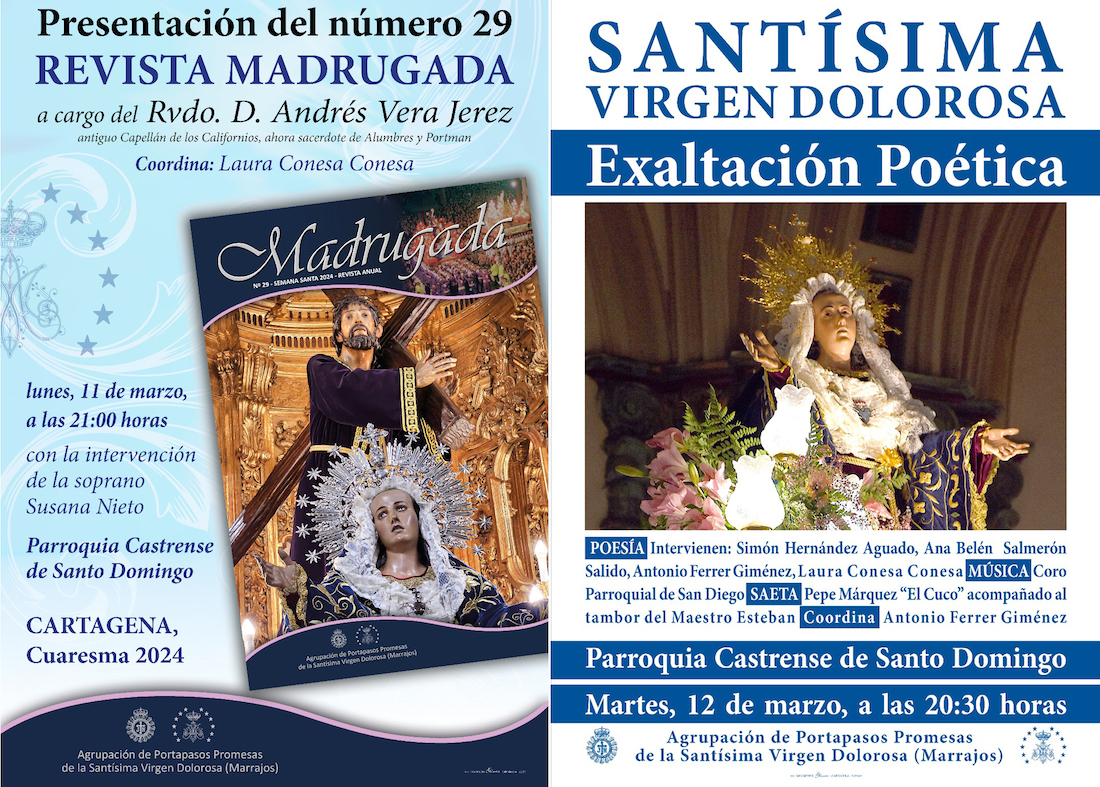 La parroquia de la calle Mayor es el marco donde hoy (21 horas) la agrupación de Portapasos Promesas de la Virgen Dolorosa da a conocer el contenido de su revista, a cargo de Andrés Vera, excapellán californio y actual párroco de Alumbres y de Portmán. El martes, también en acto marrajo, tendrá lugar la exaltación poética a la Santísima Virgen Dolorosa (20.30 horas), actividad que se enriquecerá con saetas.