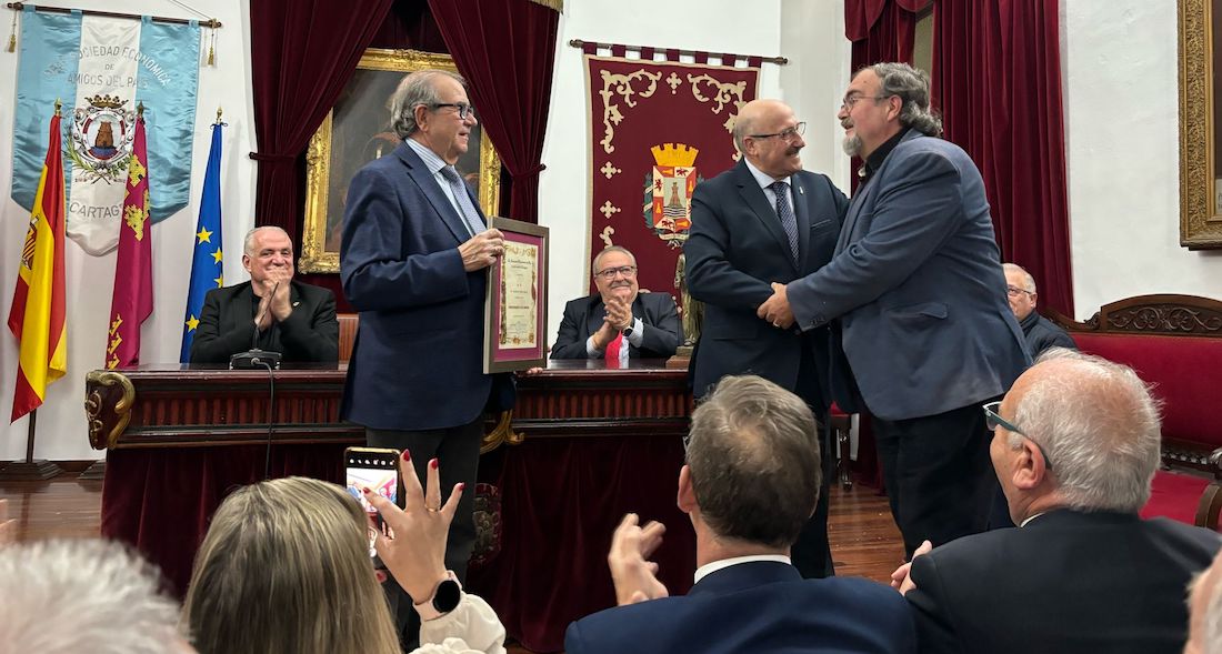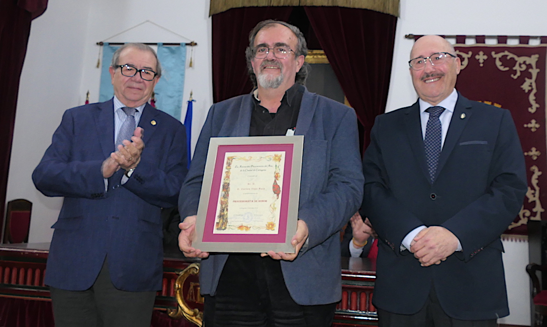 El programa de la Semana Santa de Cartagena’24 de la asociación ‘Premio Procesionista del año de la ciudad de Cartagena’ está ofreciendo esta cuaresma un ciclo de conferencias. Anoche, el protagonista fue el delegado de hermandades y cofradías de la diócesis de Cartagena, Alfonso Alburquerque, quien versó sobre la caridad y cuyo artículo ofrecerá este diario en cuanto esté montado el vídeo que grabó la empresa local 'Cartagena cofrade'. A su conclusión, Pedro Negroles, en representación de su junta directiva, llevó a cabo el nombramiento de Carlos Illán Ruiz como 'Procesionista de honor' por la labor informativa hacia la Semana Santa de Cartagena que lleva efectuando desde hace treinta años, primero en el diario La Opinión y desde 2009 en el periódico que dirige: www.cartagenadehoy.com