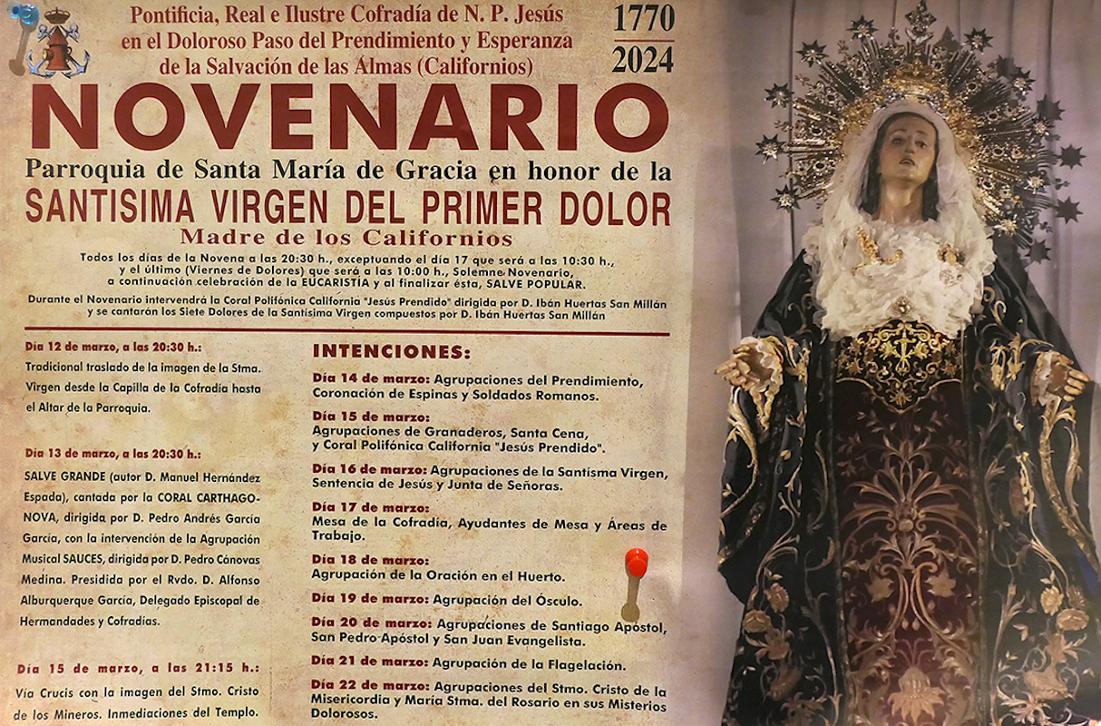 Comienza el novenario en honor a la madre de los californios con el tradicional traslado de la imagen (esta noche a las 20.30 horas) desde su capilla al lugar donde estará ubicada este miércoles para el principal acto de la hermandad en cuaresma, que tendrá lugar el miércoles (20.30 horas). Los siguientes días serán para las intenciones, además del vía crucis del Cristo de los Mineros de este viernes. En la foto, la imagen el pasado 6 de febrero, en el 24 aniversario de su coronación canónica.