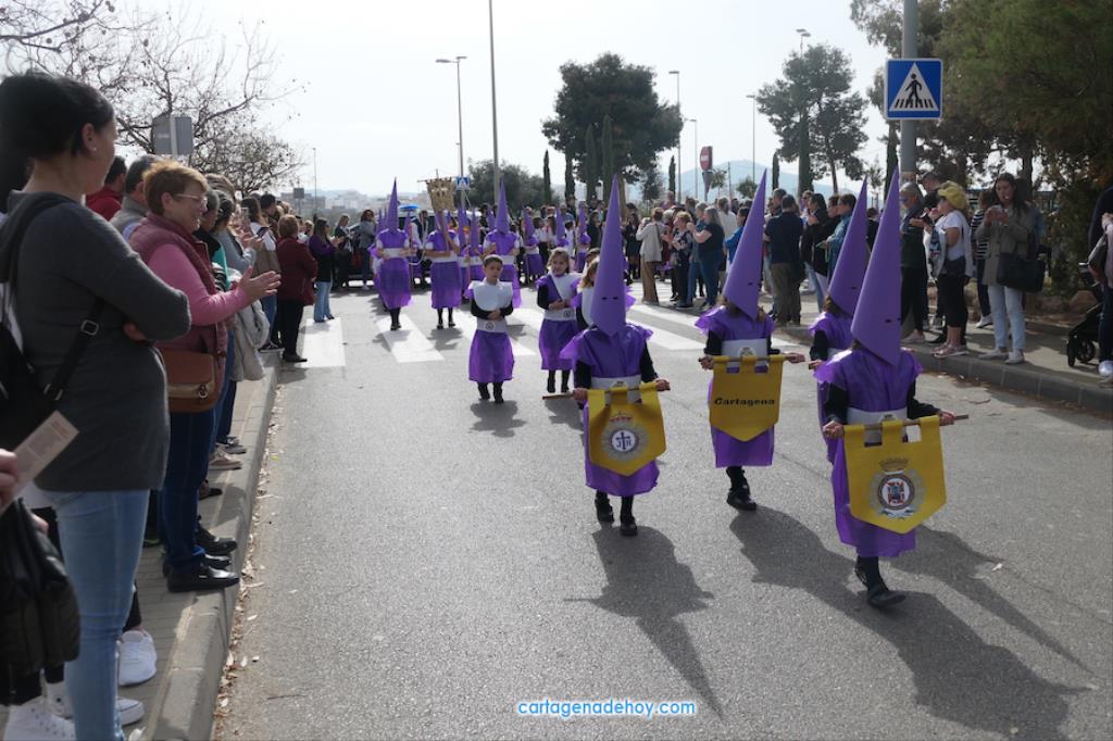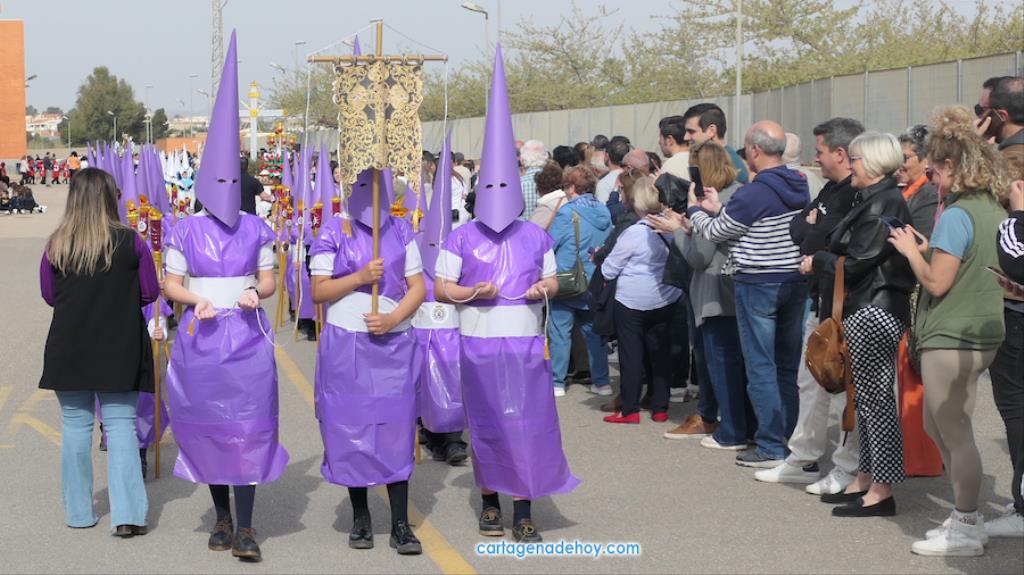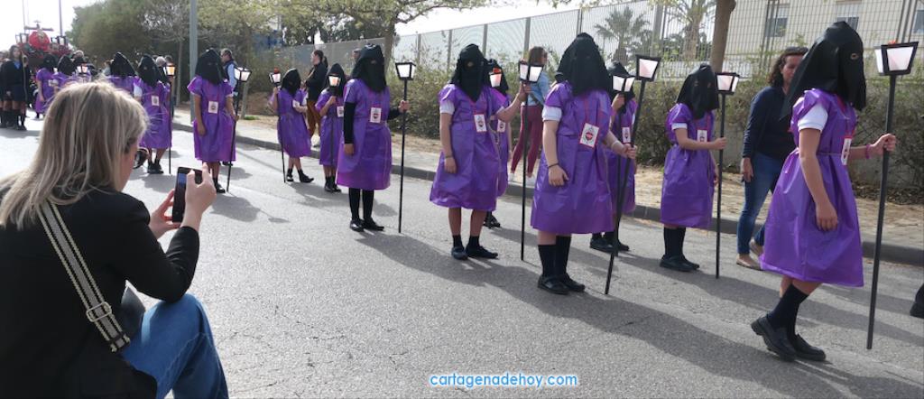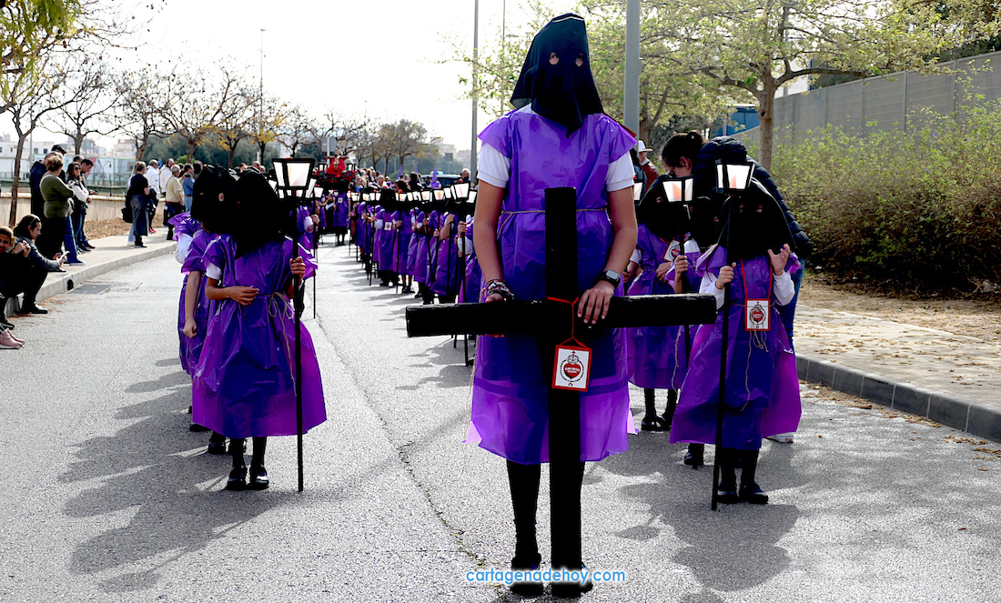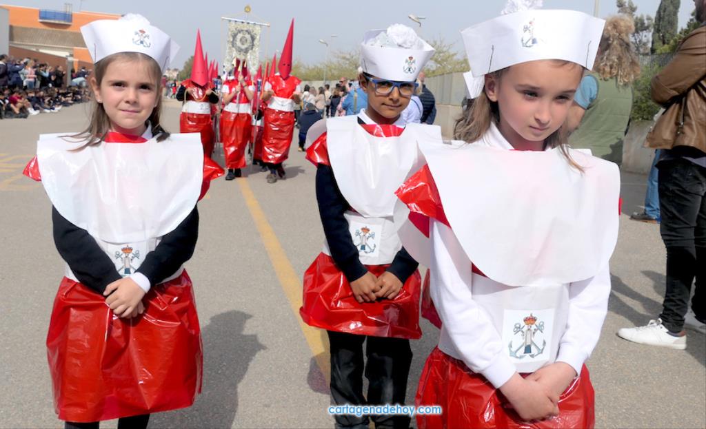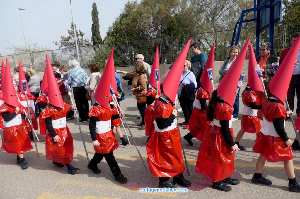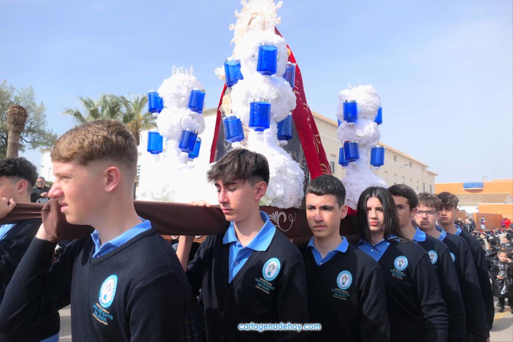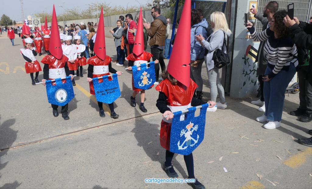 El colegio San Vicente de Paúl ha sacado su cortejo pasionario por segunda año, habiendo crecido en cuanto a elementos y participantes en esta edición. El vestuario de los alumnos, elaborado de forma artesanal, emula de los grandes cortejos cartageneros, al igual que tronos y hachotes, siendo cautivadora la visión de la puesta en escena, en la que están representadas las cuatro principales cofradías pasionarias.