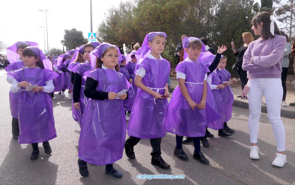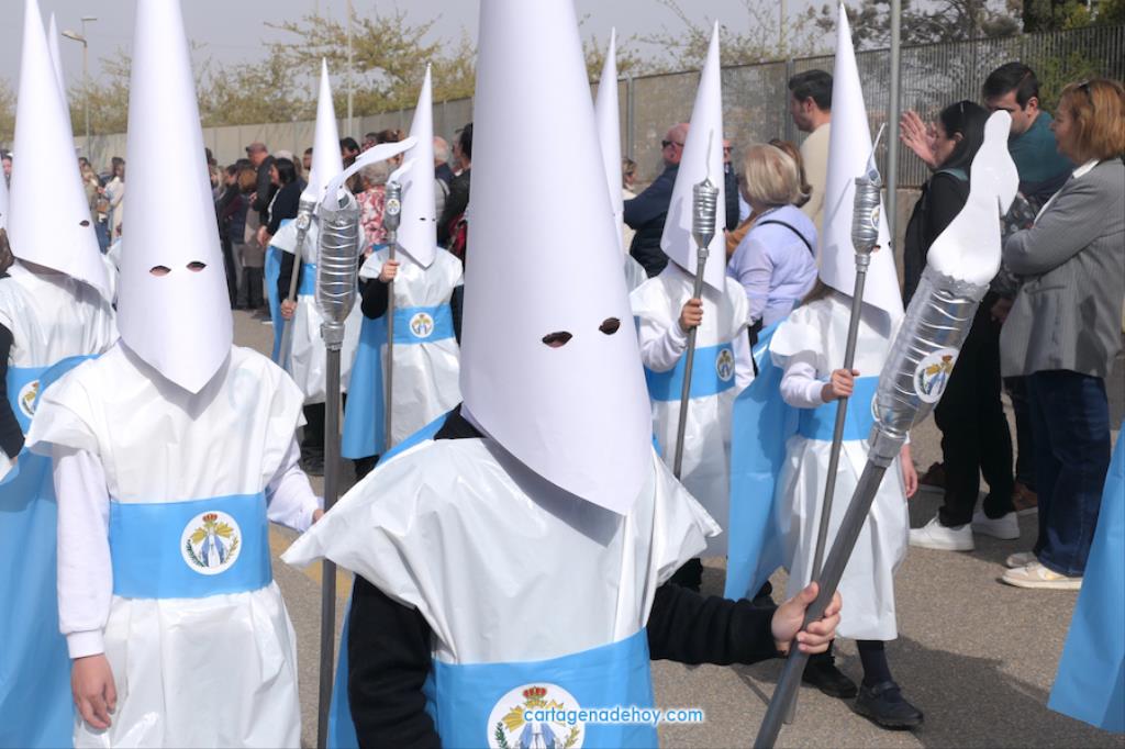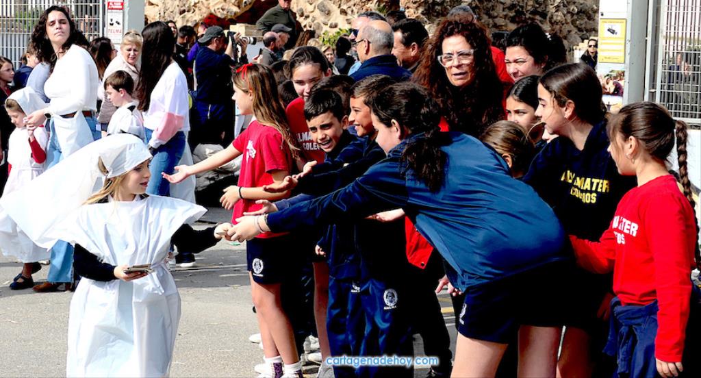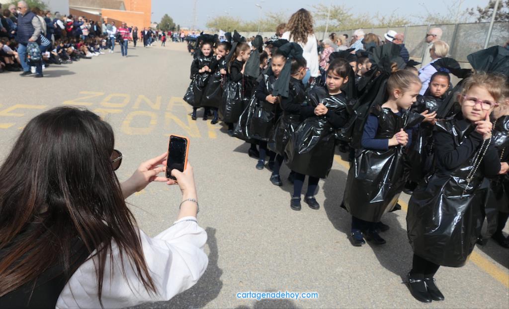 La Semana Santa de Cartagena está trabajando en conseguir su relevo generacional, pero más abajo también existe una asignatura pendiente, pues, como nos apunta algunos cofrades, cada vez es más difícil que los chavales se 'enganchen' a las procesiones. Muchos los hacen porque ahí los 'colocan' sus padres, pero conforme crecen se van liberando de esa obligación. Por ello, para que no sea una obligación y sí una devoción, son importantes iniciativas como las que llevan a cabo algunos colegios. En este caso, ha sido el colegio San Vicente de Paúl el que nos invitó a contemplar su desfile pasionario y lo cierto es que ha sido una sorpresa muy agradable y cautivadora.