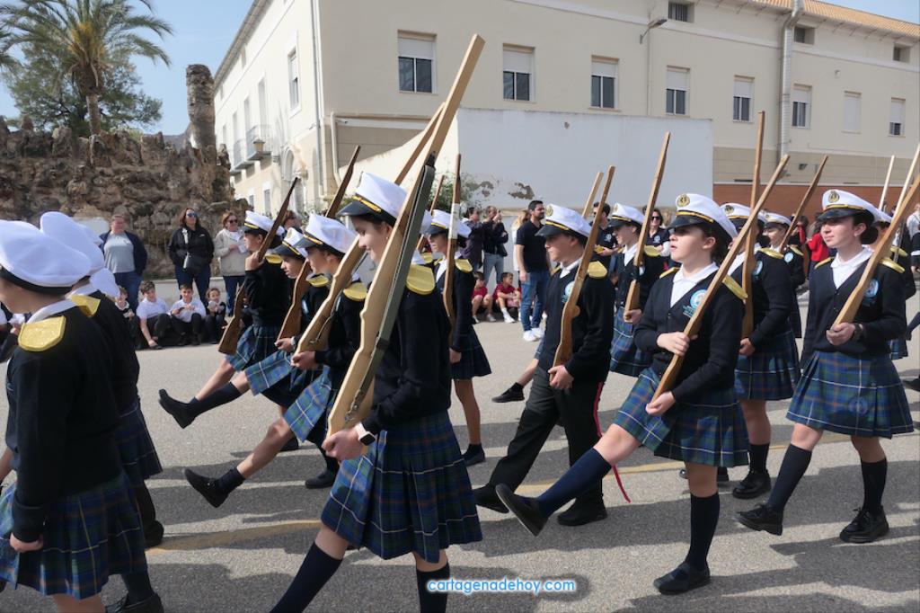 Los (muchos espectadores) han podido sentir muchos lazos comunes con el joven desfile escolar y el tradicional de la ciudad, desde los sonidos hasta el cierre con piquete que luce gorra militar y fusiles de madera pasando por los colores como por la formación. Ha faltado el típico orden del paso cartagenero, pero, nunca mejor dicho, todo se andará. También hay numerosos detalles, como los símbolos y dibujos, relacionados. No falta en los tres grupos nazarenos (marrajo, resucitado y marrajo) la entrega al público de postales. Unas son de elaboración propia y otras han sido aportadas por las hermandades o agrupaciones. Otro detalle que gusta es que la paridad de sexos es absoluta, siendo todos los tronos llevados por grupos mixtos de costaleros.