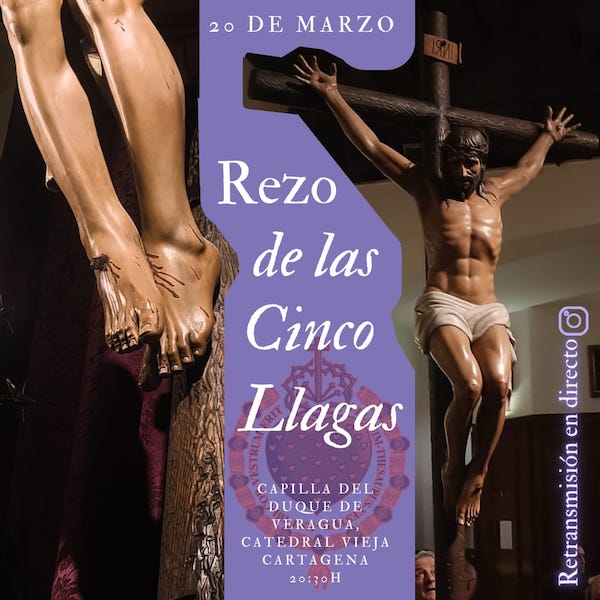 La Agrupación de Portapasos del Santísimo y Real Cristo del Socorro celebra hoy su tradicional Liturgia de las Cinco Llagas. Será a las 20:30 horas en la capilla del Duque de Veragua de la Catedral de Santa María la Mayor en Cartagena.