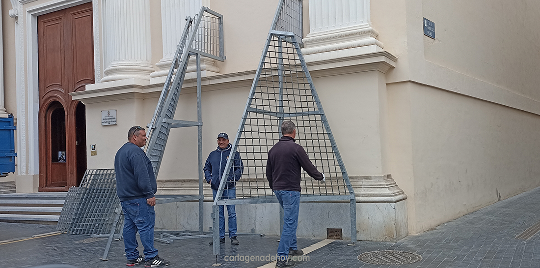 Por su parte, trabajadores del Ayuntamiento de Cartagena han estado montando ante la basilica las estructuras donde se depositaran las flores que llevaran las numerosas asociaciones del municipio.