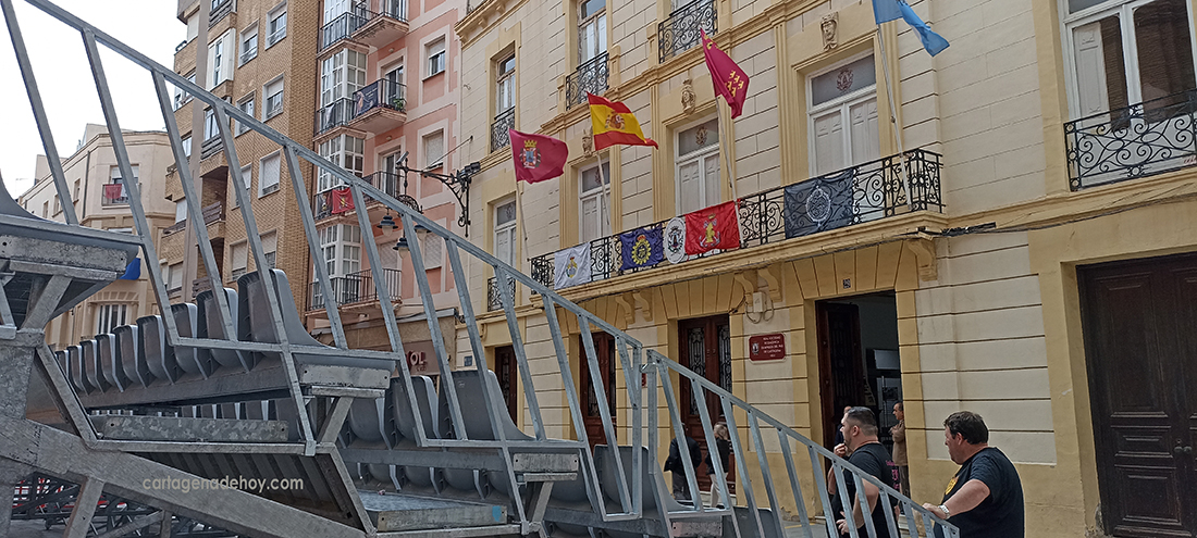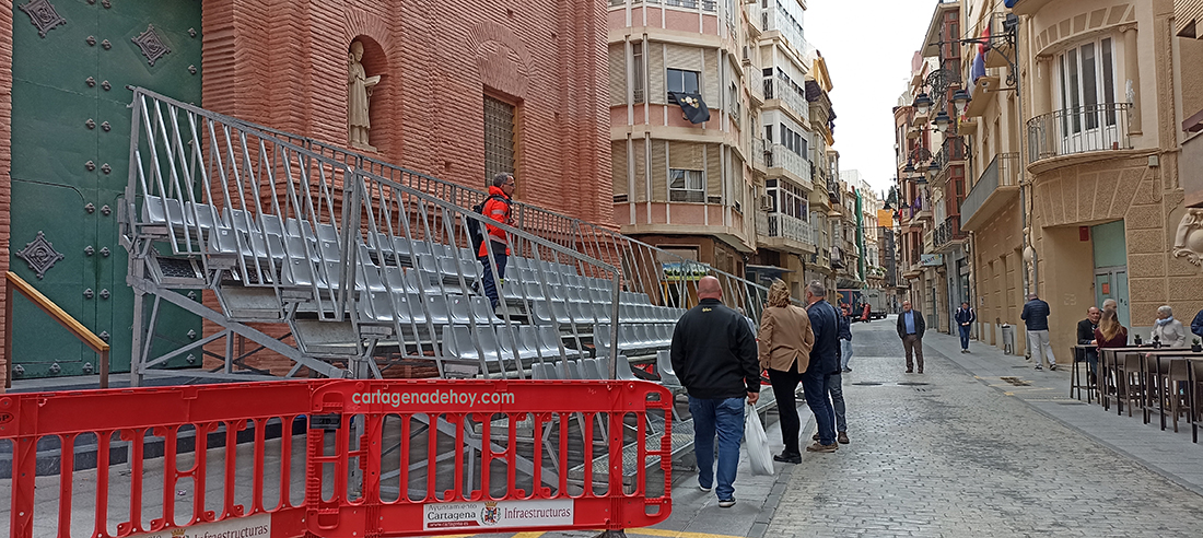 Una de las novedades de la Semana Santa de este año es la instalación de dos graderíos, con capacidad para unas cuatrocientas personas, junto a la puerta de la iglesia de Santa María, lugar por donde salen y se recogen casi todos los desfiles pasionarios de Cartagena.