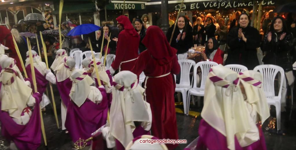 Las primeras gotas han aparecido a las siete y cuarto de la tarde, que enseguida se han transformado en lluvia, lo que ha generado el despliegue de infinidad de paraguas y huidas en busca de refugio para los que no lo llevaban. Las familias han sacado del desfile a algunos nazarenos de corta edad, pero en las filas de penitentes y en los grupos de portapasos se seguía dando el paso hasta en los momentos en que caía más agua, incluidos algunos grupos de banderines con pequeñines de muy corta edad. Los numerosos aplausos que han recibido todos eran más que merecido y hasta emocionaban.