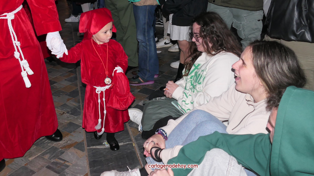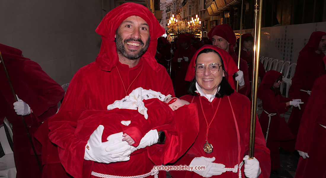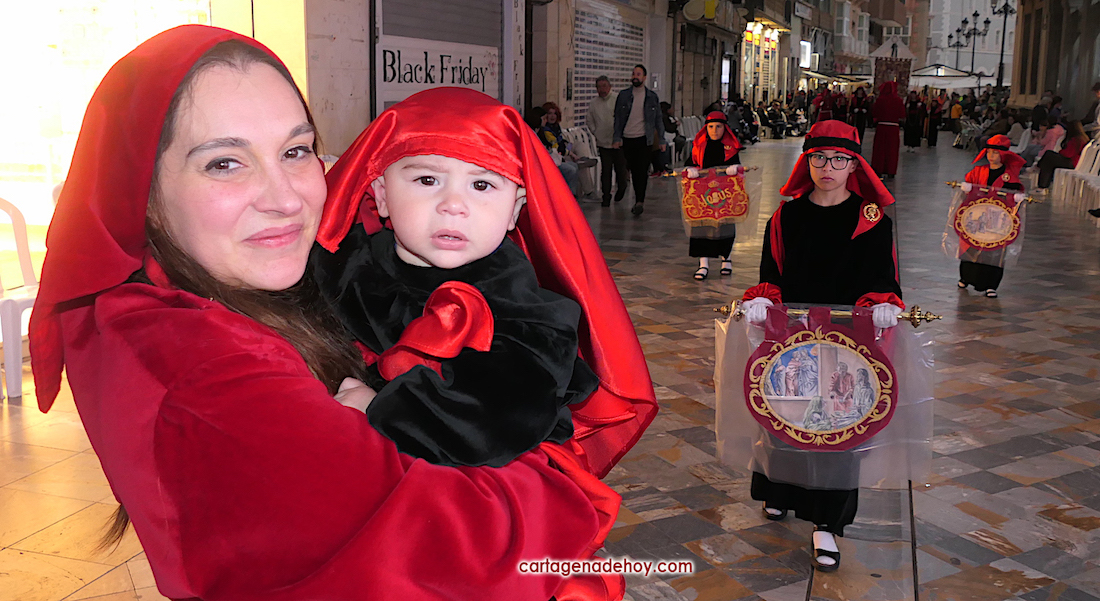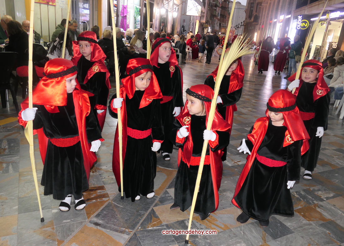 La cantera de procesionistas de la Cofradía California se exhibe en la procesión del Domingo de Ramos. ¿Desde qué edad? Las fotos que ofrecemos demuestran que, casi, con nacer basta. En la imagen, Jaime repartiendo caramelos con 16 meses de vida.